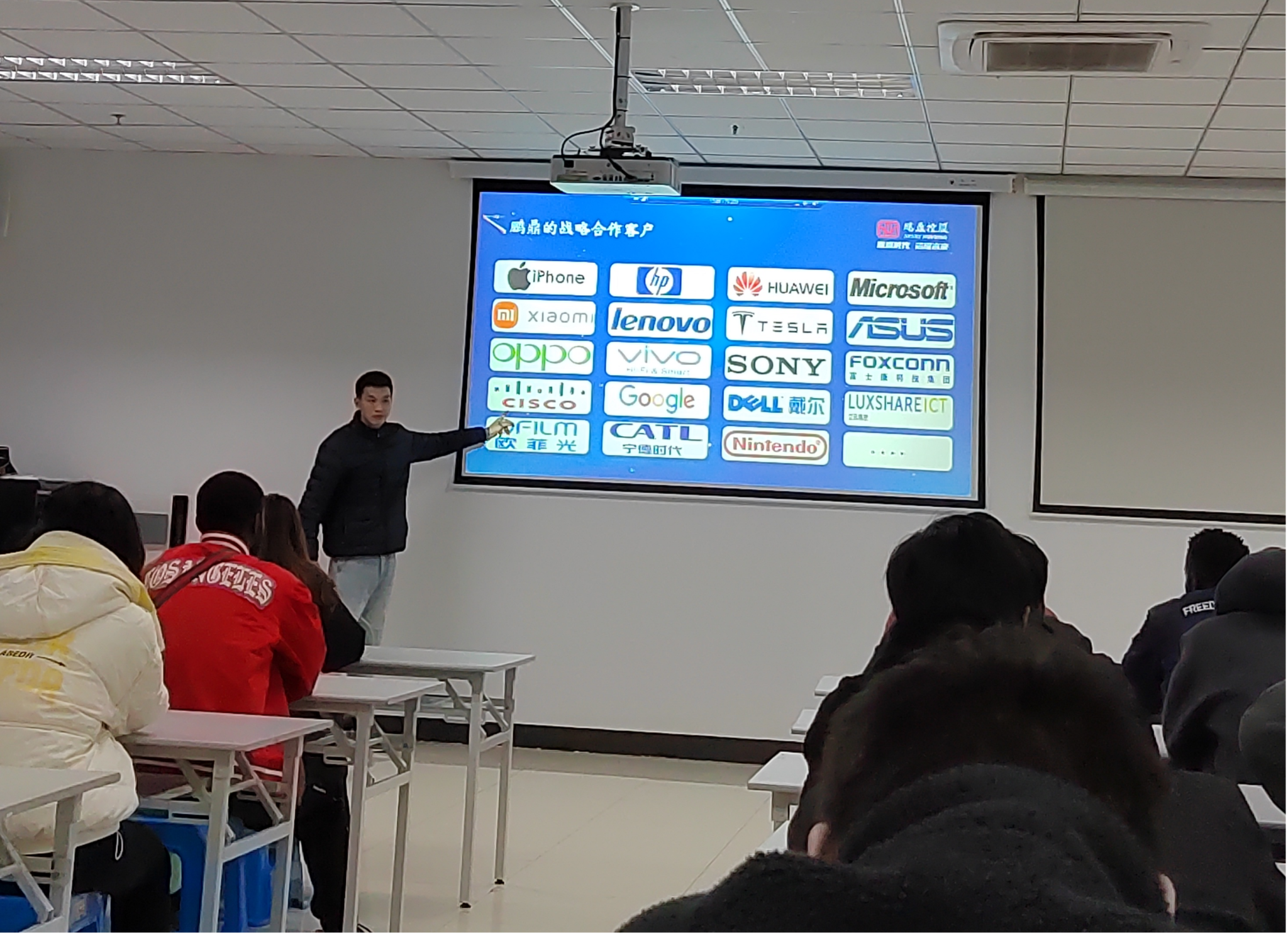 在淮安鹏鼎公司,员工主要听取了陕西理工大学学长介绍电子线路板行业发展趋势、智能手机中元器件生产制造行情、行业就业经历及未来几年内的职业规划。