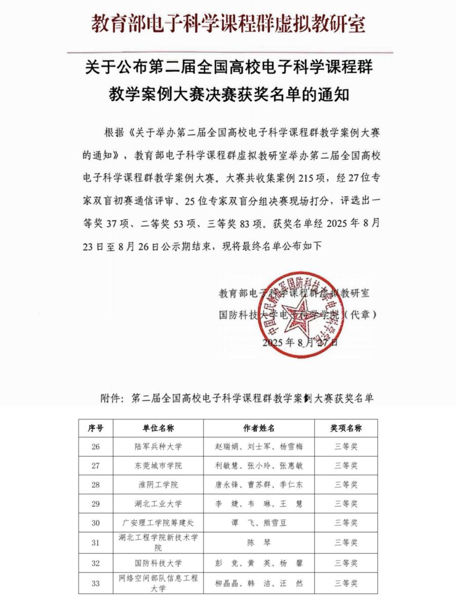 8月下旬,在第二届全国高校电子科学课程群教学案例大赛中,公司唐永锋等教师提交的专业思政教学案例从215个参赛项目中脱颖而出,荣获三等奖。这一成绩体现了公司在课程思政建设与教学资源开发方面的扎实积累。