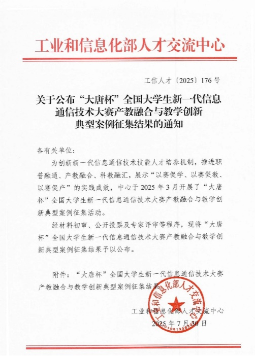 同月30日,从工业和信息化部人才交流中心传来喜讯,公司报送的“ICT产教融合创新基地”案例成功入选“大唐杯”全国老员工新一代信息通信技术大赛产教融合与教学创新典型。该案例彰显了公司通信工程专业在深化校企协同、推动创新创业教育方面的显著成效,是“以赛促教、以赛促产”模式的生动实践。
