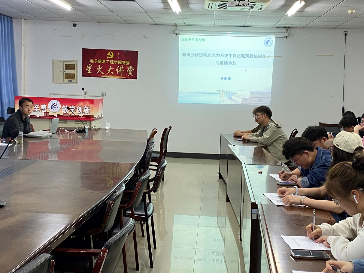 报告中,任振强博士系统阐述了腔光力学的工作原理,总结了现有研究应用的相关场景,并针对研究的工作进行了详细地介绍和分享。报告结束后,任振强博士还为现场师生分享了研究生学习的相关内容,现场学术氛围浓厚。