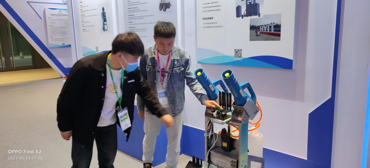 在成果展中,电信院带来的“基于5G通信控制的智能喷雾机器人”作品安排在了人工智能展区,引来不少参展人员的观看咨询,并且得到了很多业内人士的建议支持。
