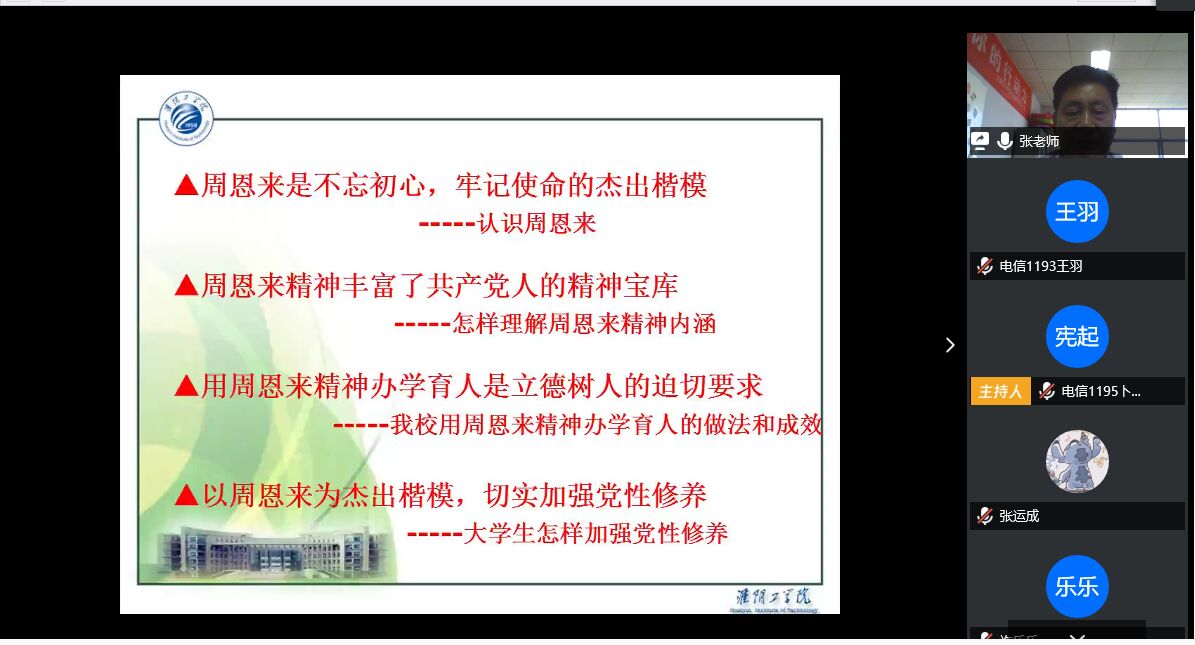 党课伊始,张乃钟老师向同学们讲述了周恩来生平事迹,展现了周总理不忘初心、牢记使命的杰出楷模形象。并通过中央几代领导人对周总理的高度评价,表现出“恩来精神”对丰富共产党人精神宝库的重要性。接着,张老师结合公司“恩来精神”办学育人的成效,强调了用“恩来精神”办学育人是立德树人的迫切要求,公司将“恩来精神”融入各项活动的做法促进了育人目标的实现,使得公司形成了鲜明的育人特色。最后,张老师鼓励同学们以周恩来总理为榜样,切实加强自身党性修养。