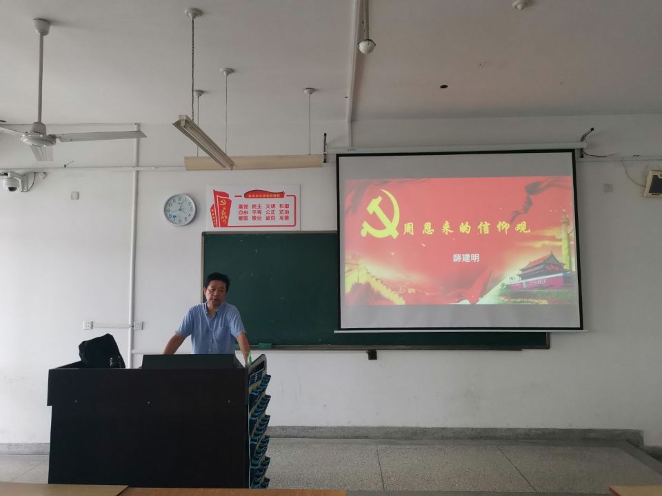 本次课程主要从信仰观的形成、信仰的坚定、信仰的时代价值三个方面向同学们进行讲解。首先,薛建明通过康得、马克思等名人的例子,向同学们说明了人需要有自己的信仰,有正确的人生观、价值观。其次,薛建明还向同学们讲述了周恩来“为中华之崛起而读书”的励志故事以及周恩来在面对“入地狱”、“入虎穴”、“入苦海”、“九四一生”等艰难困境下坚定自己信仰的伟大品质。最后,薛建明阐述了在实现中华民族伟大复兴道路上,周恩来信仰观对党的领导仍有很好的指导作用。