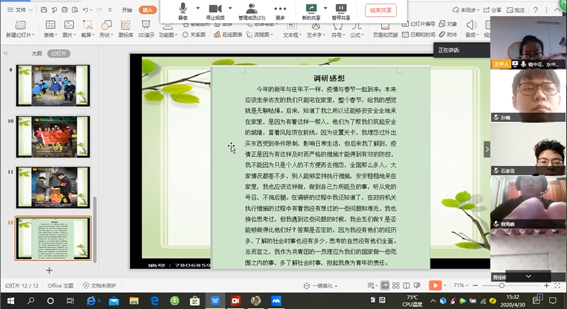 本次素养实践活动活动旨在让同学们感受青春的力量,积极表达自己对青春的认知。各团支部组织开展“拿起你的麦克风”征文活动,同时动员参与微博“我的青春关键词”话题讨论;活动期间,各团支书向大家展示了疫情防控期间青年志愿者们的青春风采,让同学们更直观地感受到了青年一代在此次战“疫”中勇于担当的精神,明白了疫情当前新时代青年们应尽的责任。