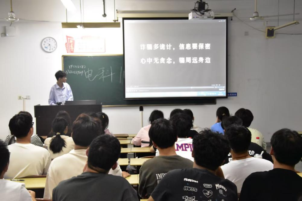 电科1231班班助王晶晶邀请了光电1212班学长学姐们给新生们分享了一些大学干货。秦凯楠学长为新生进行了反诈宣传,主要介绍了诈骗方式及预防诈骗提示,并用真实事例为同学们讲述了电信诈骗危害。胡思宇学姐提醒新生注意安全,讲述了宿舍中的违禁用品,可能导致电路短路、火灾等危险情况的发生。