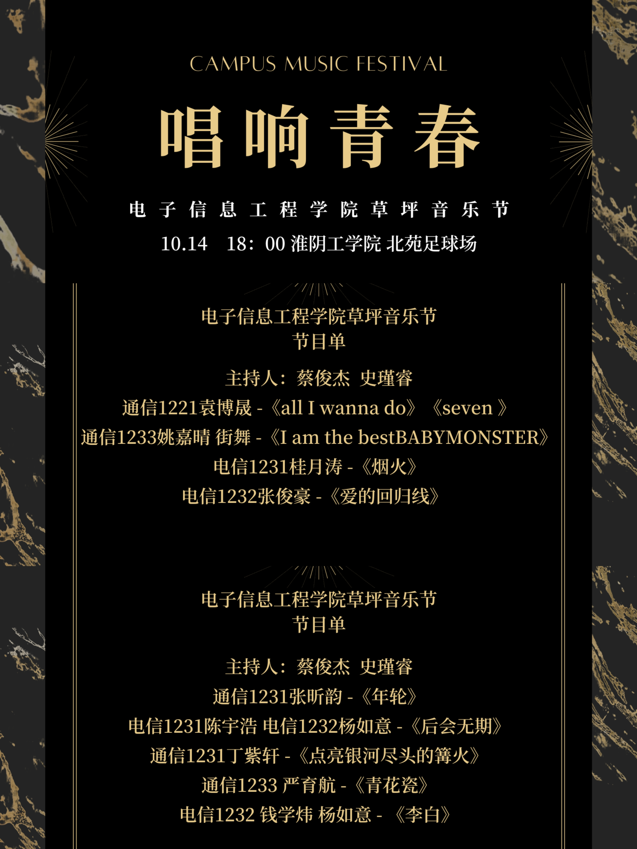 为丰富校园文化生活,展现青春激昂风采,云顶国际yd333于10月14日晚6点在枚乘路校区北苑操场举办“以歌会友,唱响青春”草坪音乐节。