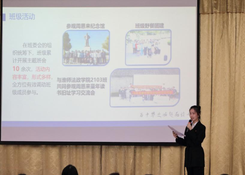 在评选活动开始前,主持人详细的介绍本次大赛的展示环节要求和评分标准。随后各个参赛班级代表依次上台,运用ppt、融合短视频、舞蹈等形式从多方面展现了班级之美。各班汇报人着重就班级概况、班风建设、班级成就及未来展望四个方面展开。他们用勤学笃思展现学习之美,团结友爱展现集体之美,志愿服务体现实践之美,俭以养德体现生活之美……各班级声情并茂的演讲和精彩纷呈的展示赢得了在场观众的热烈掌声。