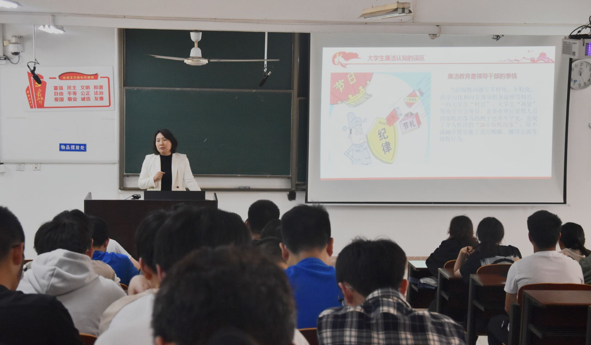 王海云以“26岁干部落马”事例生动地向同学们讲述了从“象牙塔”进入社会后不久,就陷入贪腐的“泥潭”,告诫同学们要廉洁自律,避免走上歧途误终身。她指出盲目消费、攀比消费、铺张浪费、考试作弊、论文抄袭、弄虚作假等不良消费行为和违纪行为在老员工中蔓延,希望同学们能够增强廉洁认知、提升廉洁认同、树立廉洁观念,践行廉洁行为,做到诚信考试、学术诚信、杜绝员工活动中的“微腐败”,能够廉洁自律、不贪不腐,旗帜鲜明的与腐败行为斗争。