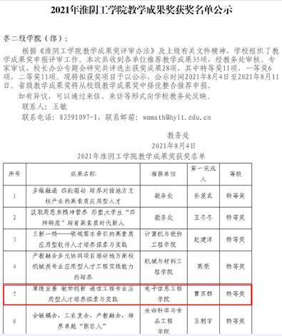 2019年江苏省高等教育教改研究课题重中之重“课程思政指标点分解及案例库建设探索与实践”项目按期结题;教学成果《汲取周恩来精神营养形塑老员工“四种特质”培育高素质时代新人》荣获2021年江苏省教学成果奖(高等教育类)一等奖;教学成果《厚德至善 敏学创新 通信工程专业应用型人才培养探索与实践》荣获2021年云顶国际yd333教学成果特等奖。