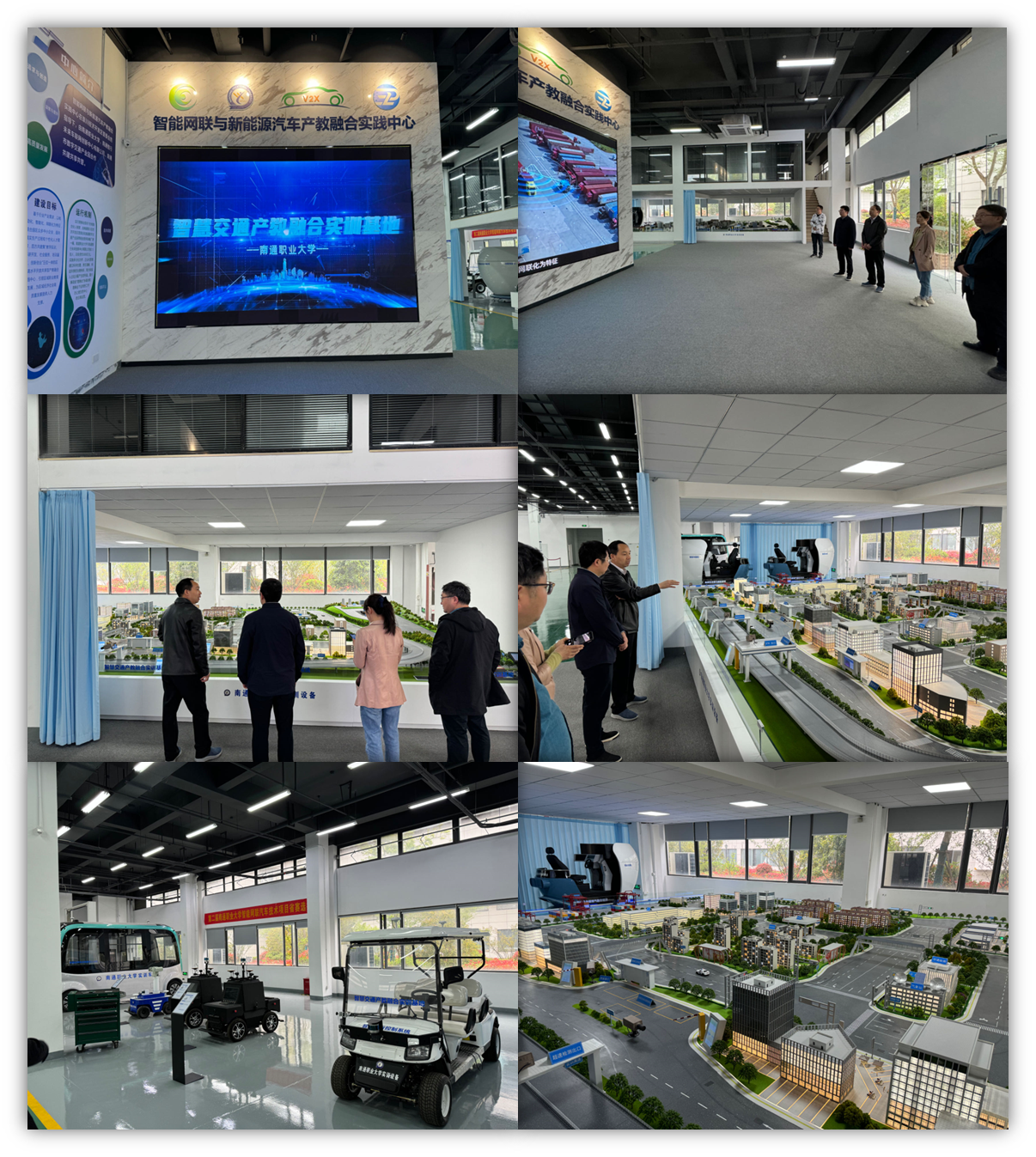 在南通职业大学智能网联与新能源汽车产教融合实践中心,公司一行参观了整车综合教学区、高精度地图与导航实训室、电动小车线控底盘实训室、车路协同感知实训室、车路协同通讯技术实训室、云控中心调度平台实训室、车路协同计算单元实训室等理实一体化教室,并现场观摩了道路交通实训模型电动小车智慧驾驶演示。