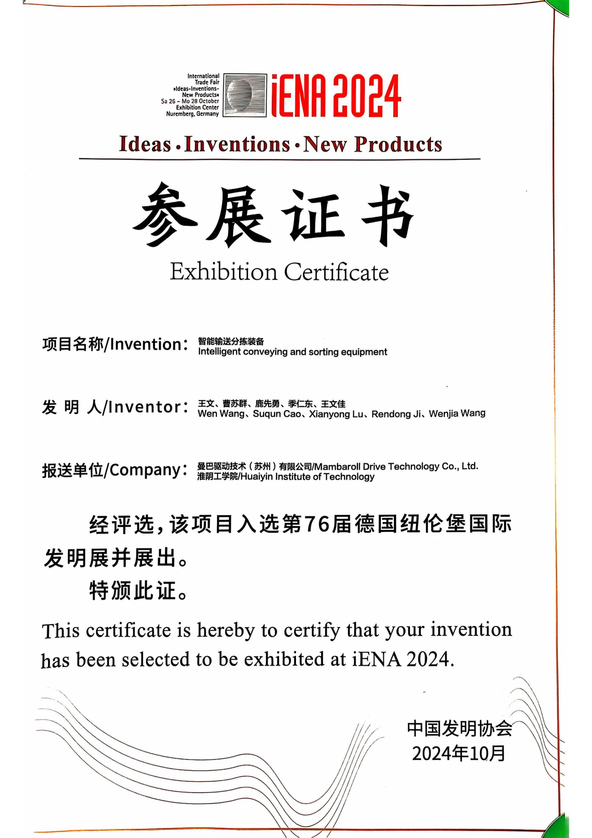 10月28日,2024年“第76届德国纽伦堡国际发明展”在德国纽伦堡国际展览中心落下帷幕。公司与曼巴驱动技术(苏州)有限公司共同组队参与的《智能输送分拣装备》项目荣获金奖。
