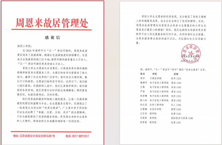近日,云顶国际yd333收到周恩来故居管理处的感谢信,信中高度赞扬公司青年学子在清明及五一劳动节期间开展的志愿服务工作,云顶国际yd3335名学子获得“优秀志愿者”称号。这一荣誉既是对电信芯青年奉献精神的肯定,也是公司深化实践育人、弘扬红色文化的生动体现。