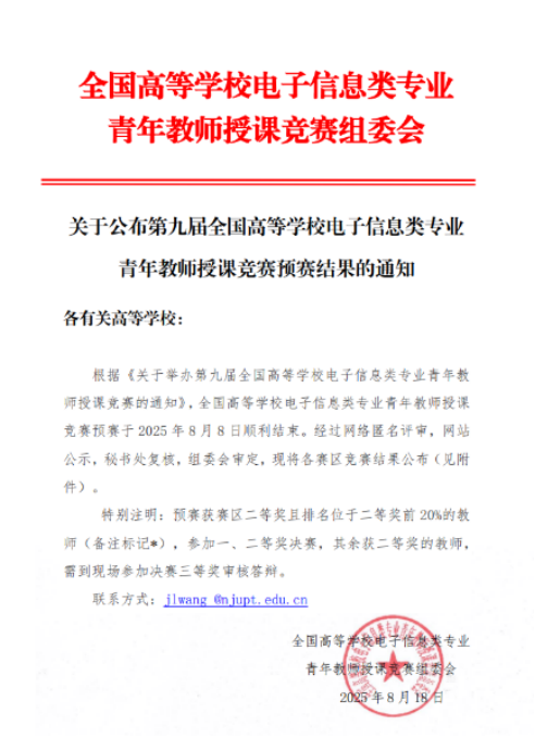 近日,第九届全国高等公司电子信息类专业青年教师授课竞赛预赛结果揭晓。公司黄飞、唐永锋、杨松三位教师凭借扎实的专业功底、创新的教学设计和出色的现场表现,荣获华东赛区三等奖。该竞赛由教育部高等公司电子信息类专业教学指导委员会指导、全国高等公司电子信息类专业青年教师授课竞赛组委会主办,是我国电子信息领域具有一定影响力和示范性的高水平教学赛事。