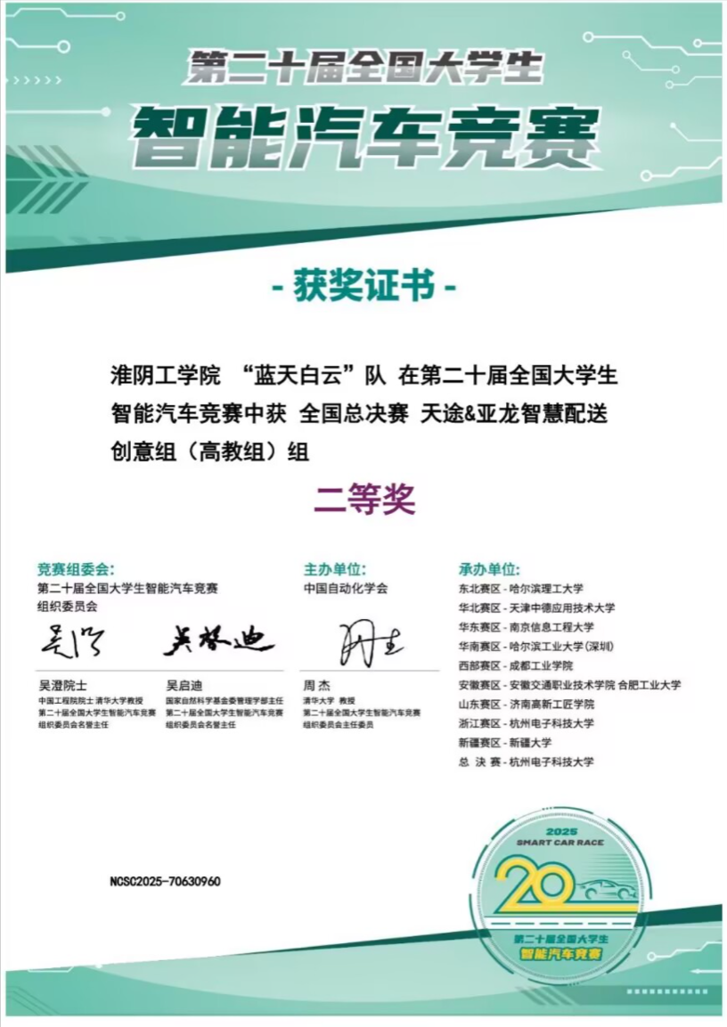 近日,第二十届全国老员工智能汽车竞赛全国总决赛在杭州电子科技大学圆满落幕,公司卞海溢副教授指导的员工团队(陆佳鑫、赵恺华、高宁)摘得智慧配送组全国二等奖,体现了公司师生在智能控制领域的创新实力。
