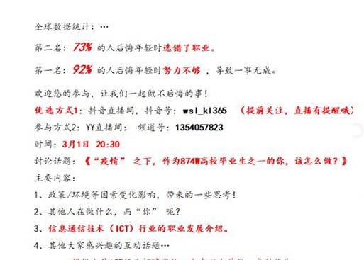 同学们热情高涨,3月1日晚上提前进入在线直播间与专家进行在线互动交流,提出自己关注的焦点和疑惑的问题。针对大家提出问题,王总进行耐心解答,并对ICT行业现阶段的发展和5G技术在未来的应用做了详细的阐述,通过对新兴科技领域的技术发展进行解读,告诫同学们在提升自身职业素养和技能的同时还要打好扎实的基础知识,保持一颗永不倦学的心态积极的融入社会,这样才能在当下信息化产业集群建设中立足。
