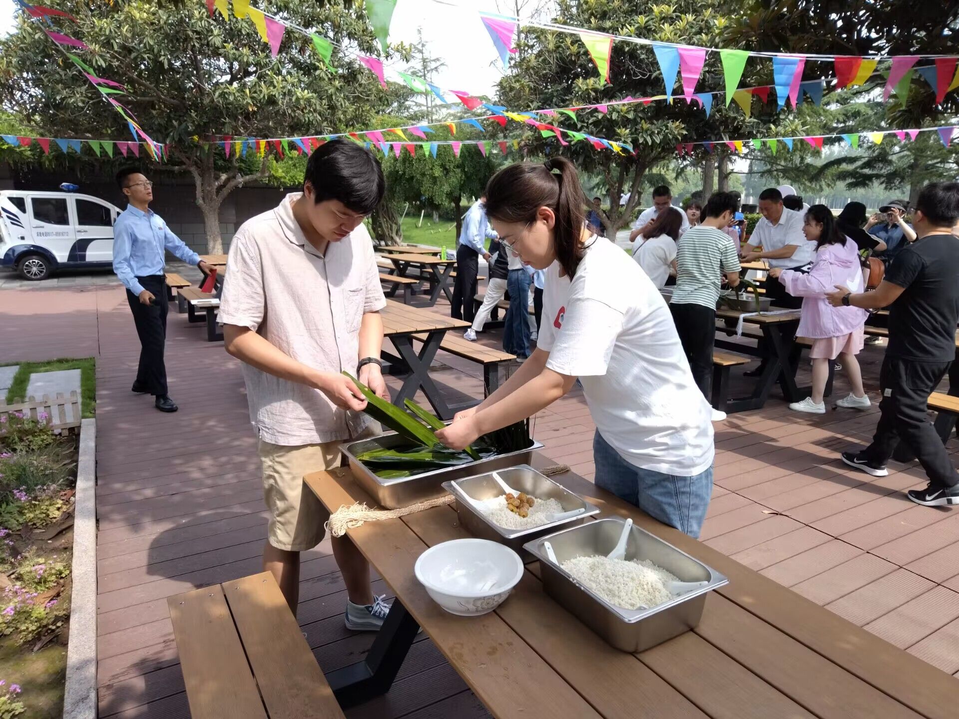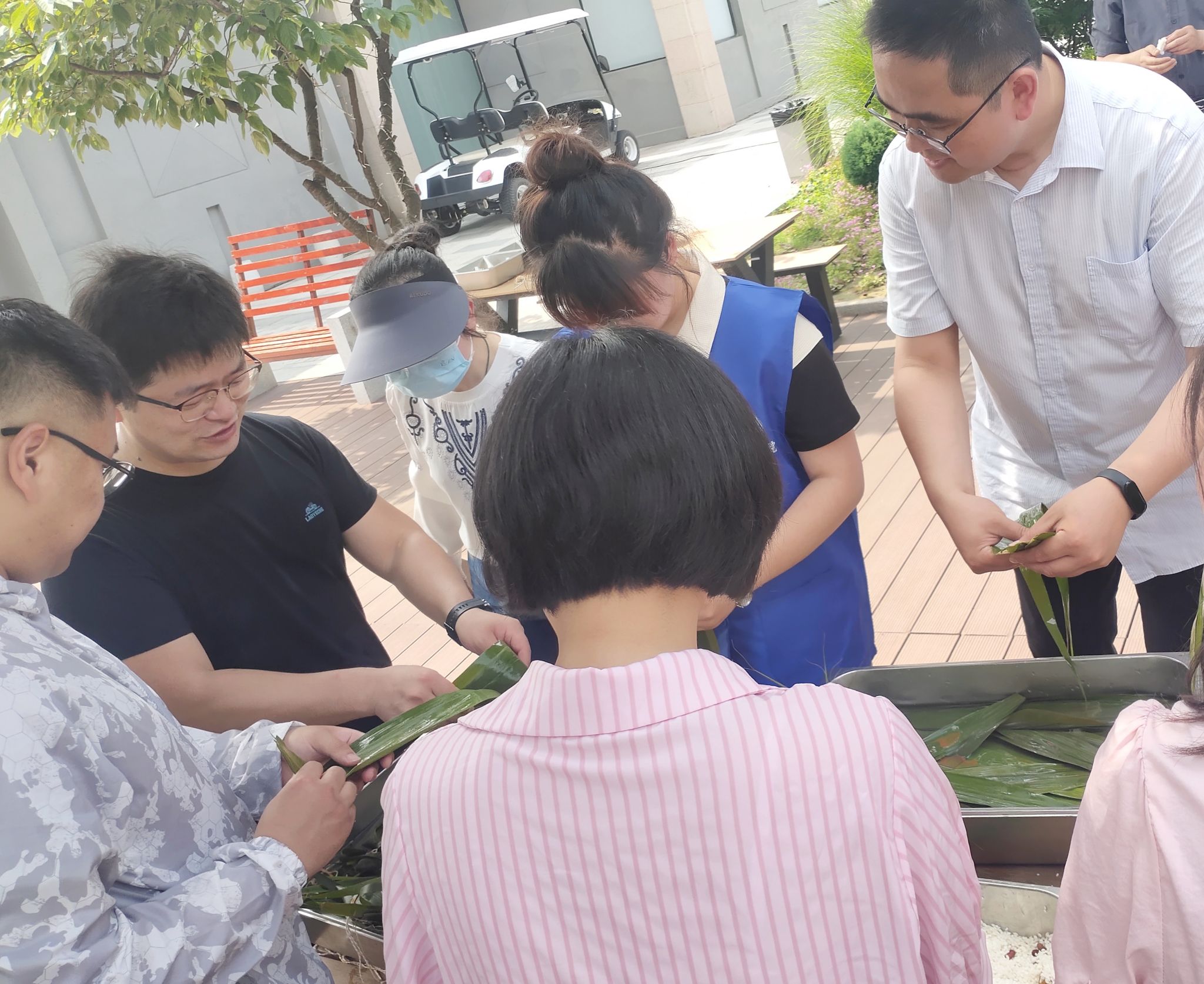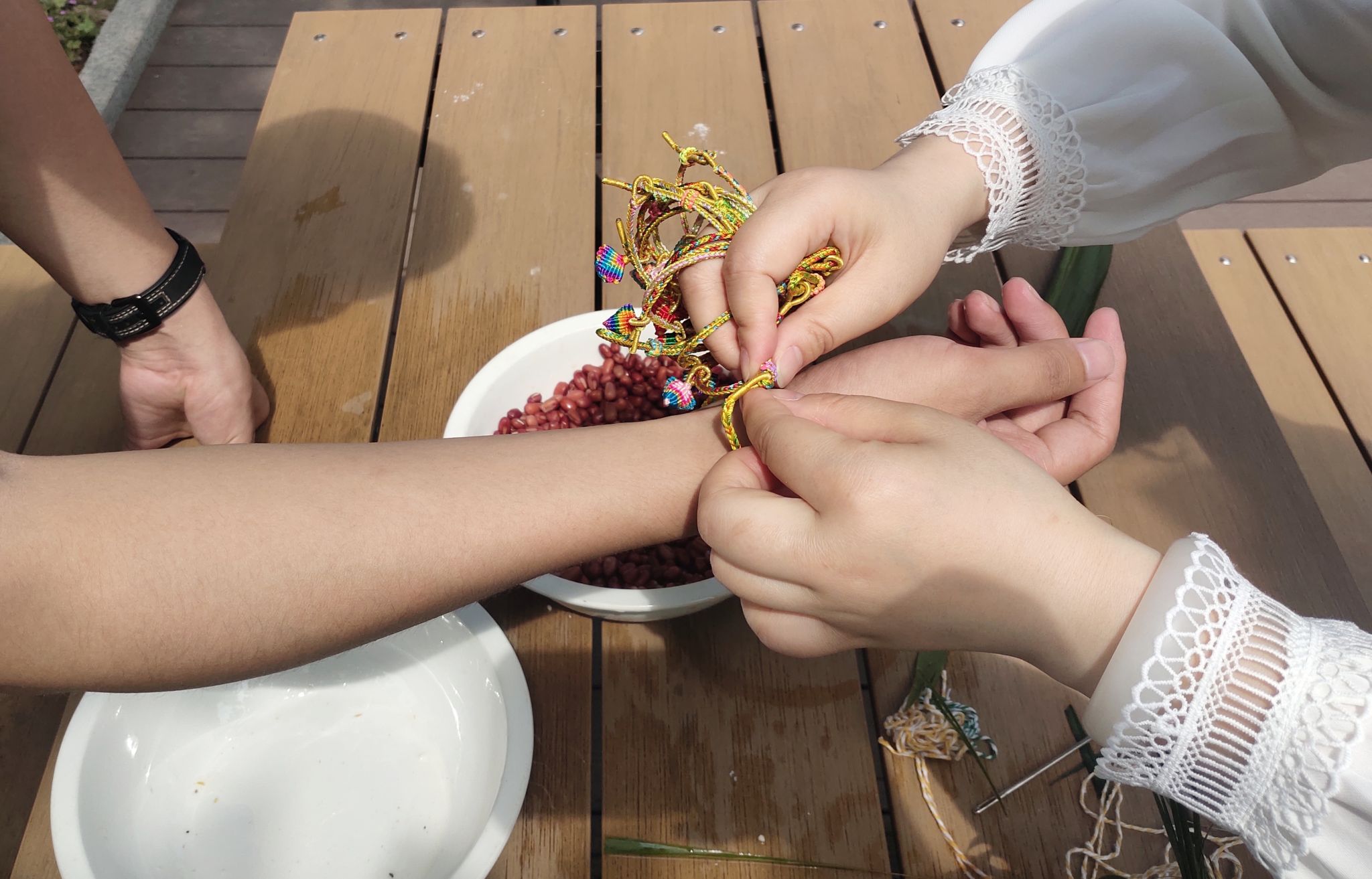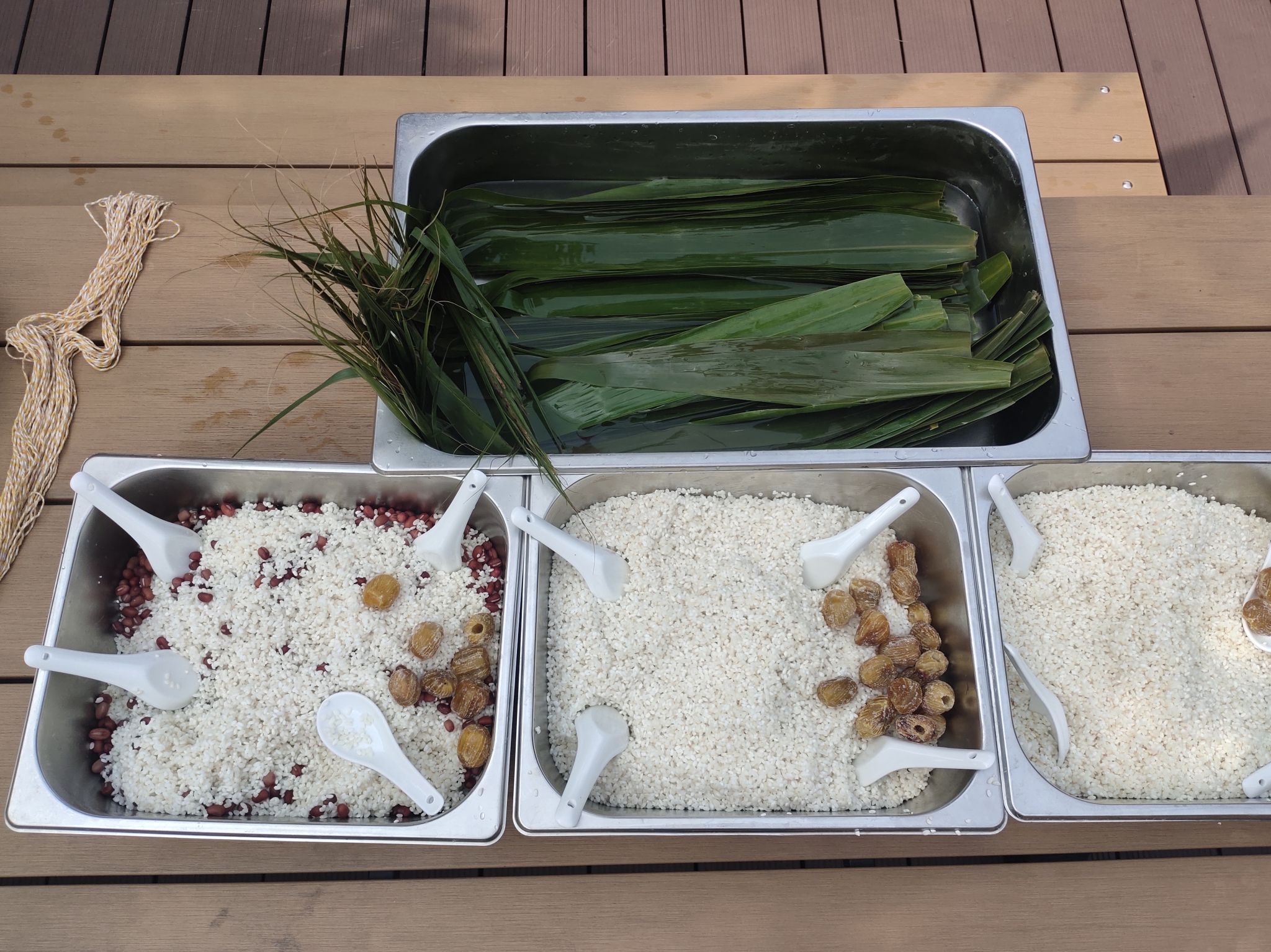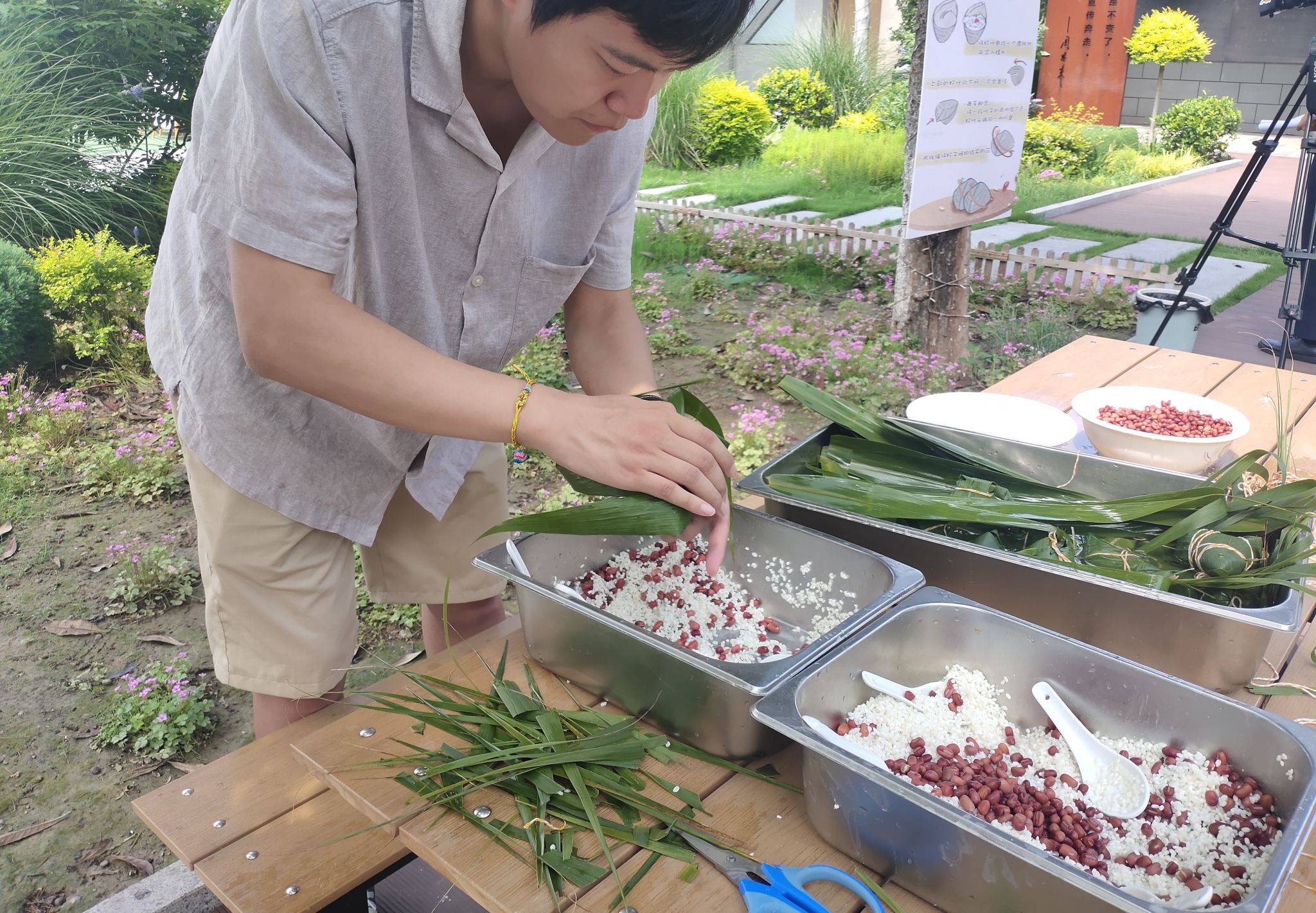 一早,活动现场就已经准备好了泡过的糯米、红豆、艾草叶和绳子。本次活动结合了传统习俗,带来了很多有趣的互动体验。