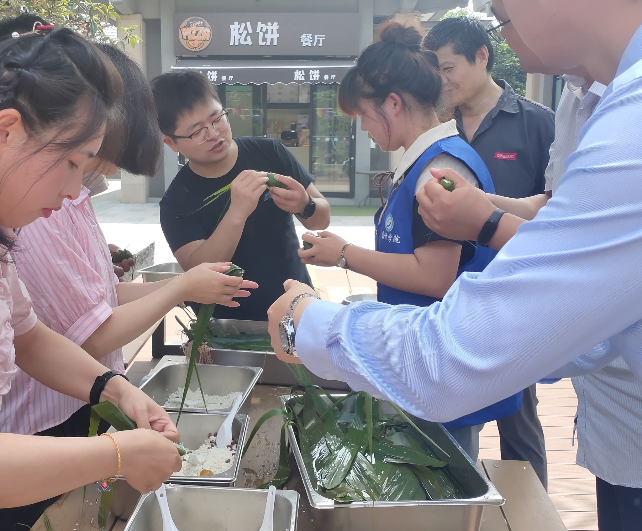 答题结束后,“包粽子”手艺比拼赛开始,在周恩来纪念馆皇甫主任的耐心带领下,大家开始挑选粽叶,盛糯米,包粽叶,绑绳子。粽子形状各异,欢声笑语不断。再戴上可以趋凶辟邪的五彩绳手链,愿大家端午安康。