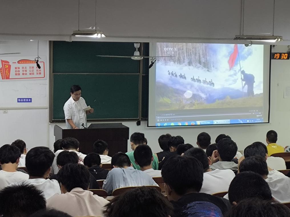 张天驰带领新生学习《习近平在中央民族工作会议上强调以铸牢中华民族共同体意识为主线推动新时代党的民族工作高质量发展》会议内容。同时他为新生播放《同心共筑中国梦》纪录片,分别从辉煌历程、共同繁荣、手足相亲、携手圆梦四个部分展现了中华民族走向团结,走向复兴,走向成功的辉煌历史。