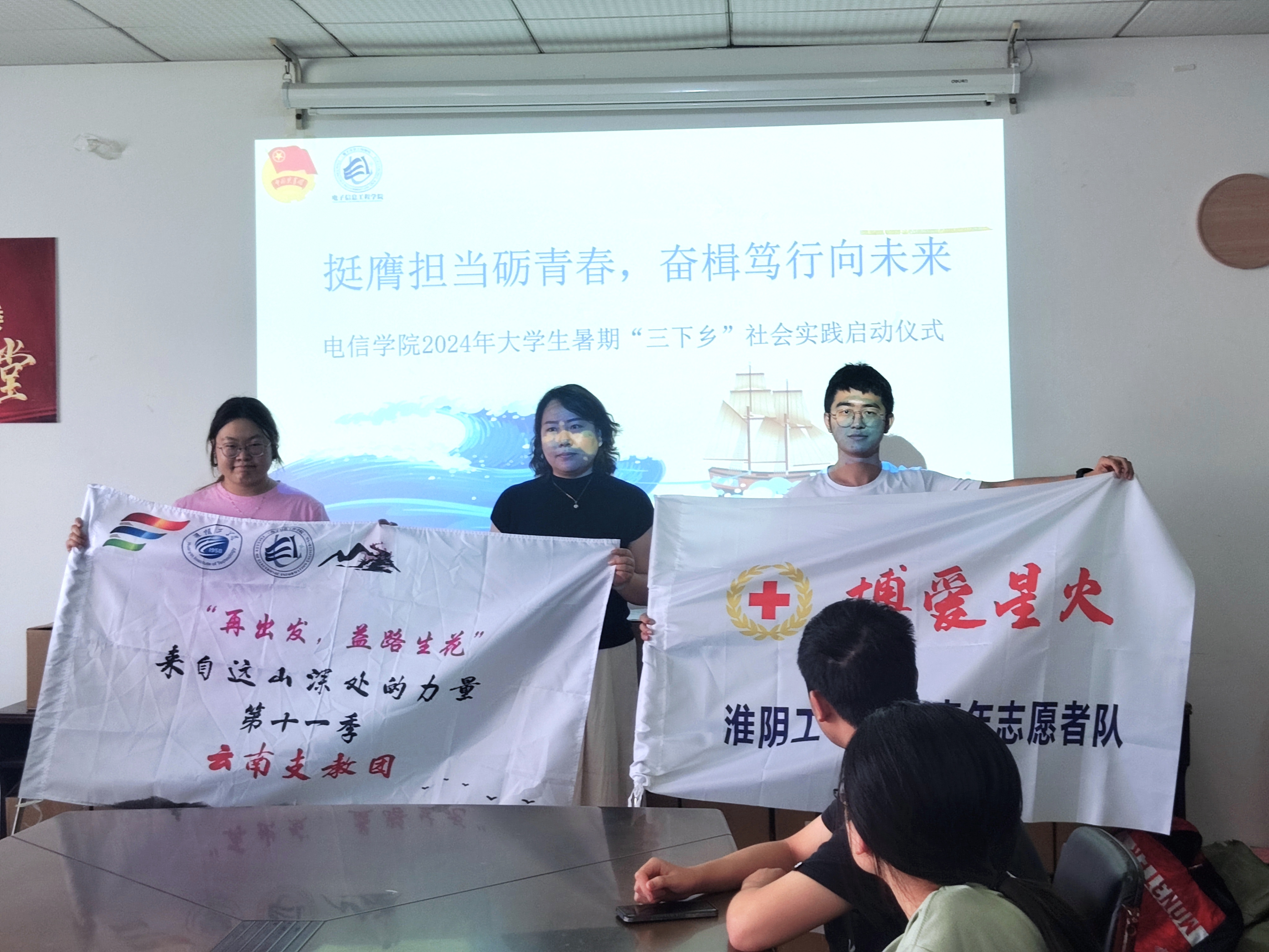 会上,公司党委副书记王海云为社会实践团队代表授旗,来自远山深处的力量支教团第十一季负责人孙煜同学作交流发言。