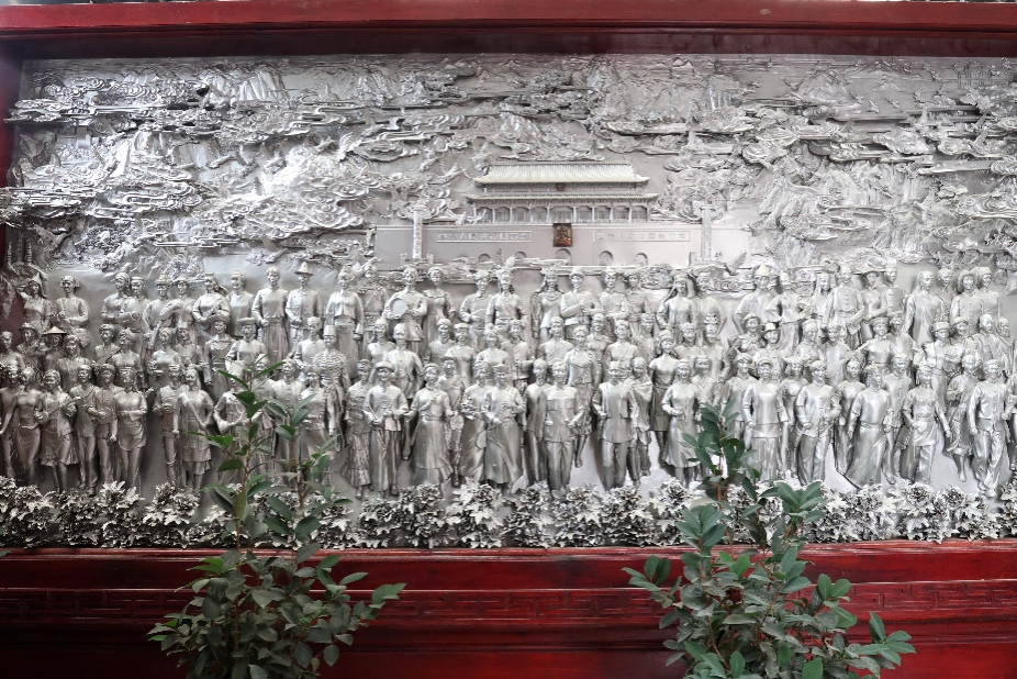 银器锻制技艺:小锤叮当,雕琢千年时光。鹤庆县新华银器小镇是驰名中外的“中国银器第一村”,志愿者们向寸氏银器制作的第六代传人寸发标先生学习探索云南非遗银器的奥秘。志愿者们被《中华民族一家亲 同心共筑中国梦》银壁所震撼,里面的每一种细节都饱含深意:56个民族每个民族一男一女齐聚在天安门前;背后三山五岳、长江黄河云蒸雾绕,万里长城盘旋其间;布达拉宫、延安、钓鱼岛、台湾、澳门、香港清晰可见;珠峰代表西藏,天山代表新疆,太阳和月亮代表中华人民共和国与日月同辉,西南三塔巍峨;113只和平鸽象征中华民族永远热爱和平,113是因为56个民族一男一女,计112个人物,加天安门上的伟大领袖毛主席,共113;99朵牡丹象征中华民族永远富贵吉祥。