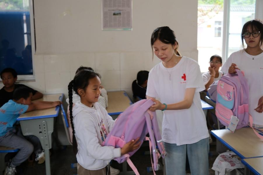 在发放仪式上,同学们井然有序地排队领取由支教团成员发放的礼包。支教团团长孙煜表示:“我们在此不仅仅是传递知识,更是传递爱与希望,让孩子们感受到,除了我们,还有更多的人在关注他们、爱护他们。这份‘成长大礼包’不只是物质上的帮助,更是对孩子们精神上的鼓励。”支教团团员夏炎也不禁感慨道:“不论起点如何,梦想总有实现的可能。每位员工都应当珍惜自己的童年,勇敢地追求梦想,不断学习和成长,长大后用爱心和行动去帮助需要帮助的人,让我们的世界变得更加美好。”