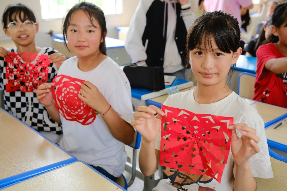 剪纸团结花,共铸民族魂。志愿者杨鑫萍以铸牢中华民族共同体意识为主题,为当地的白族娃娃们上了一堂别开生面的剪纸课。她认为56个民族是紧密相连不可分割的共同体,她希望通过剪纸这一非物质文化遗产的艺术形式,引导孩子们剪出象征民族团结的灿烂之花。志愿者讲解了剪纸的基本技巧和方法并引导孩子们动手实践,尝试用剪刀创作属于自己的剪纸作品。在课堂上,孩子们表现出极高的学习热情和创造力。剪刀在孩子们手中翻飞,纸张在他们的巧手下变成了一幅幅精美的剪纸作品。