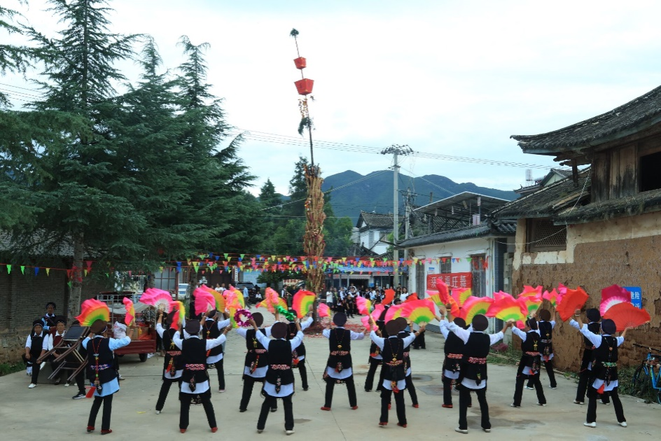 新登村一共有三个大队,这个村一共做了三个巨型火把,其中位于新登小学广场的火把最为壮观,高约十余米,气势雄伟。广场上早已人山人海,白族妇女们忙碌地分发糖果、倒茶水,在场的每个人脸上都洋溢着笑容,期待着一年一度的火把节的序幕。