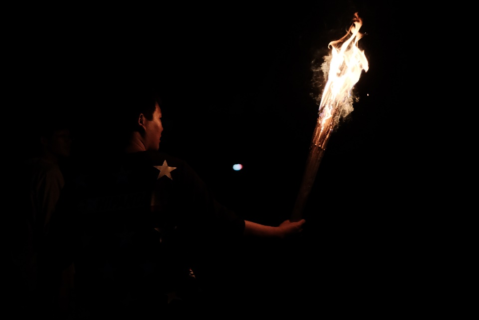 节目开始后,部分志愿者专注于舞台上的表演,而其他人则与白族娃娃们一同玩耍,挥舞着自家制作的手持火把。黑夜中,火把摇曳,火星四溅,犹如萤火虫在夜空中翩翩起舞,美丽异常,让人难以忘怀。