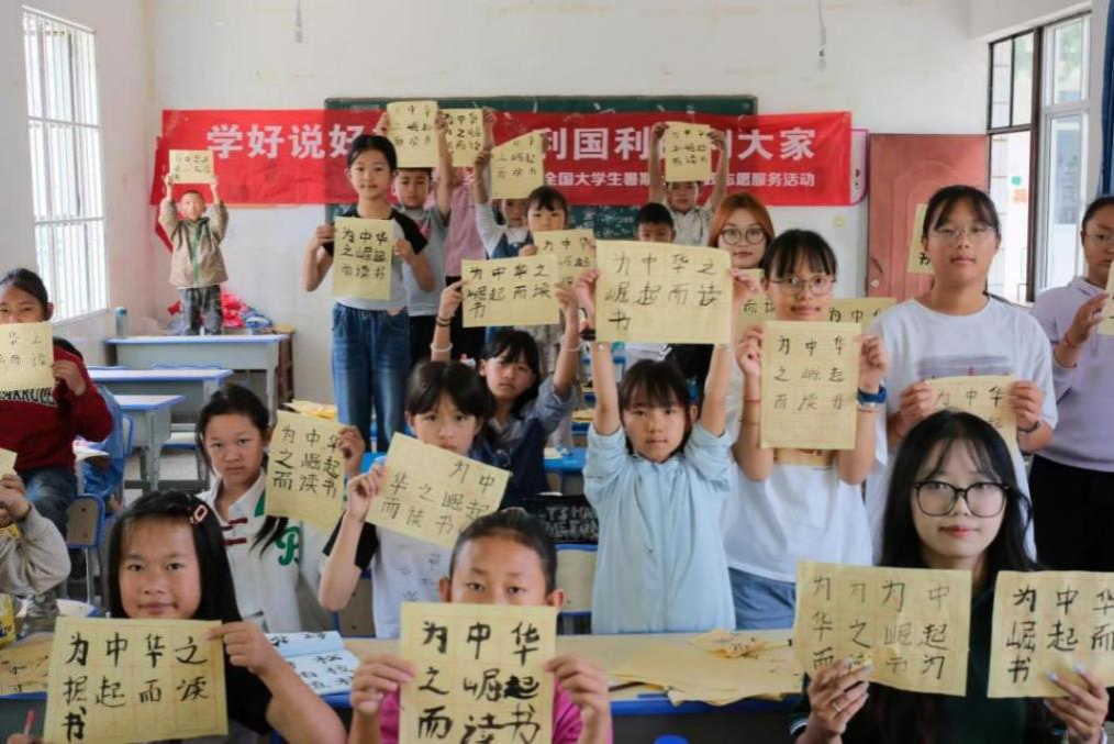 智育-文化课堂:笔墨生香,诗韵悠扬。在毛笔书法课堂上,志愿者从最基本的握笔姿势到笔画的起承转合,一步步引导孩子们感受书法的韵律与节奏。在教授笔画的同时,强调书法背后的哲学和审美,笔划的平直象征正直,点的精细鼓励细致,撇捺的舒展代表豁达……孩子们在探索中逐渐领悟到中华优秀传统文化的深邃内涵,深深感受到了中华文化的博大精深与独特魅力。而在诗朗诵课堂上,志愿者以一口标准的普通话为大家朗读诗词,引领他们走进《我爱祖国》的深情世界,逐字解析诗句中的意象与情感,感受对祖国的爱与自豪。
