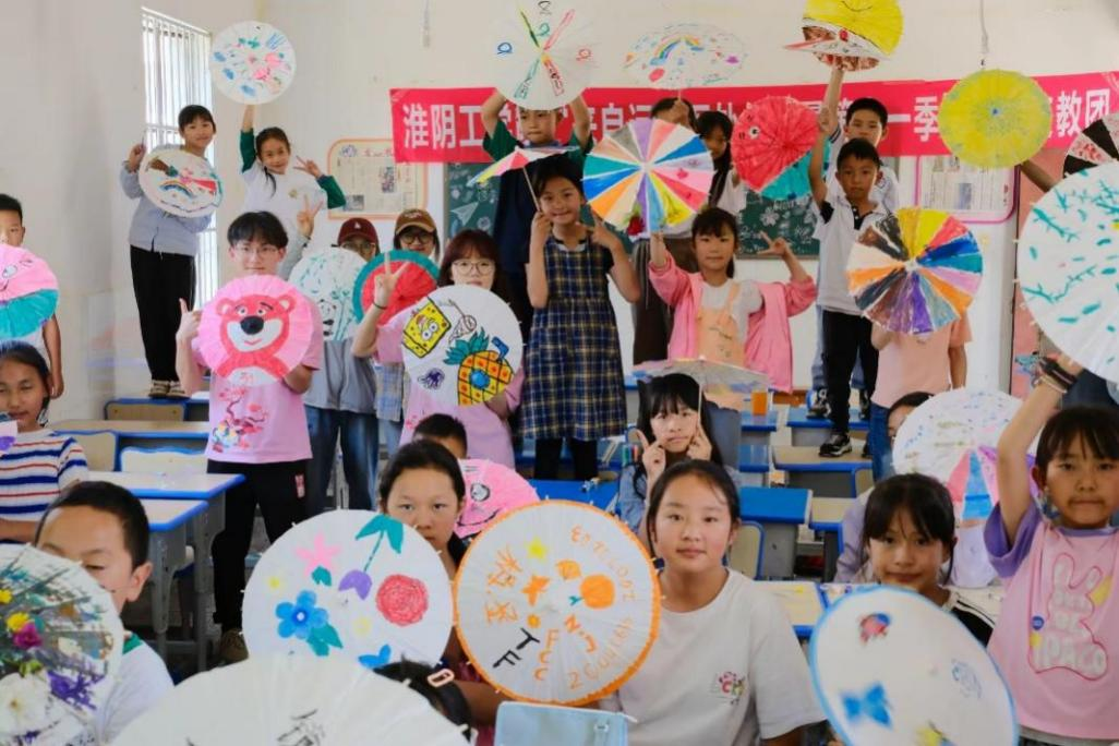 美育-手工课堂:多彩手工,幻彩童真。在剪纸团花课上,志愿者悉心讲解了剪纸艺术的基本技巧,剪刀在孩子们手中翻飞,纸张在他们的巧手下变成了一幅幅精美的剪纸作品。在伞画课上,志愿者没有设定任何限制,鼓励孩子们随心所欲地创作,他们或细心勾勒,或大胆涂鸦,每一笔都充满了童真与想象。在趣味扭扭棒课堂中,小朋友学习如何弯曲、连接扭扭棒,独一无二的扭扭棒自制眼镜激发了孩子们的创造力和想象力,让他们在玩乐中学习,在学习中玩乐。在快乐刮画课上,孩子们被分发到各色刮画纸和竹签、硬币等简易工具,有的孩子刮出了璀璨的星空,有的则将他们日常所见的风景变为了刮画中的色彩,每一次刮擦,都是对孩子们想象力的一次挑战和实现。