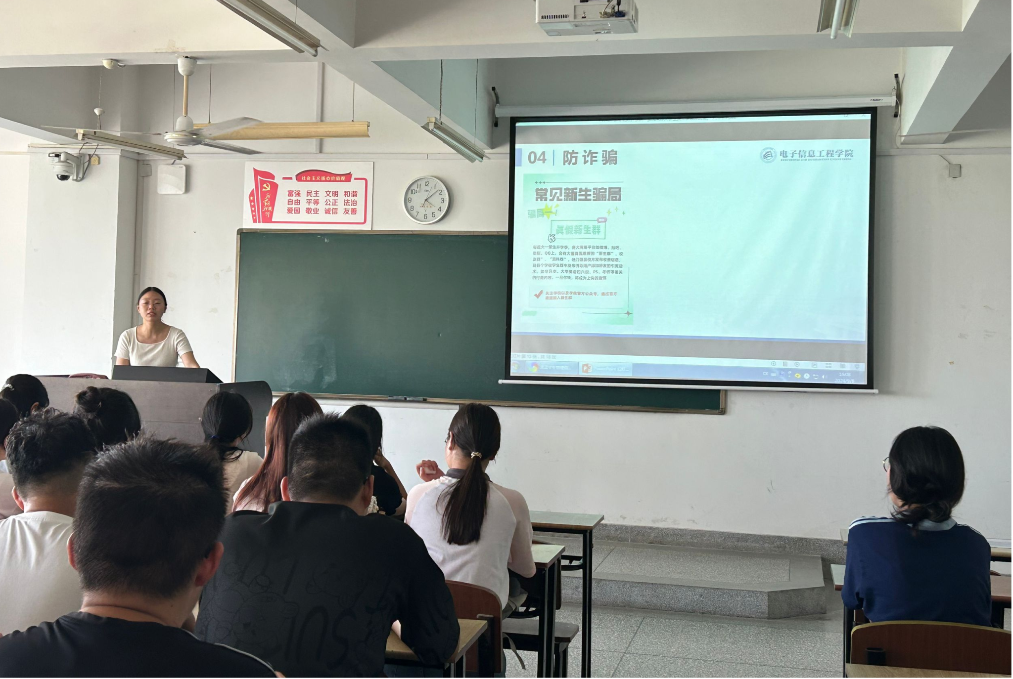各班以案例剖析、法律普及等多重形式开展新生防诈教育。通信1241班班主任结合校园内常见的几重诈骗形式,向新生强调防范电信网络诈骗的紧迫性和必要性,要保护好个人信息,时刻绷紧防范电信网络诈骗这根弦。通信1242班班助带头宣读《防诈倡议书》,呼吁同学们从现实案例中汲取教训,鉴知敬畏,防微杜渐,做“全民反诈”的先行者。