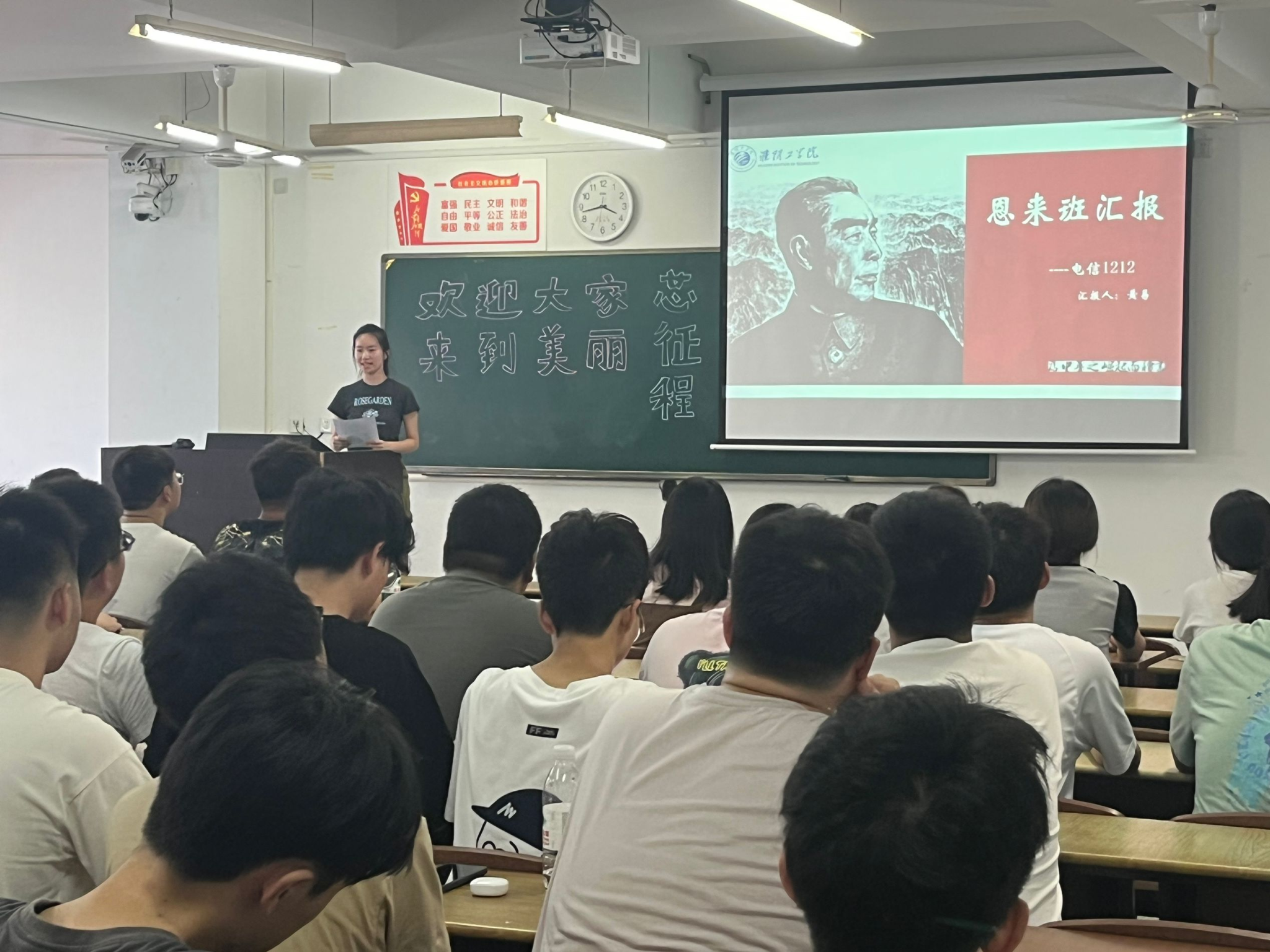 电信1241班、电信1242班班主任邀请2024年云顶国际yd333“周恩来班”电信1212班班长黄易为新生带来主题演讲。黄易从党团活动、学风建设、科技创新、志愿服务等方面,向学弟学妹们介绍“周恩来班”的创建经验。她鼓励同学们从“周恩来崇高精神风范”中汲取精神力量,志存高远,勤学善思,做校训的践行者。