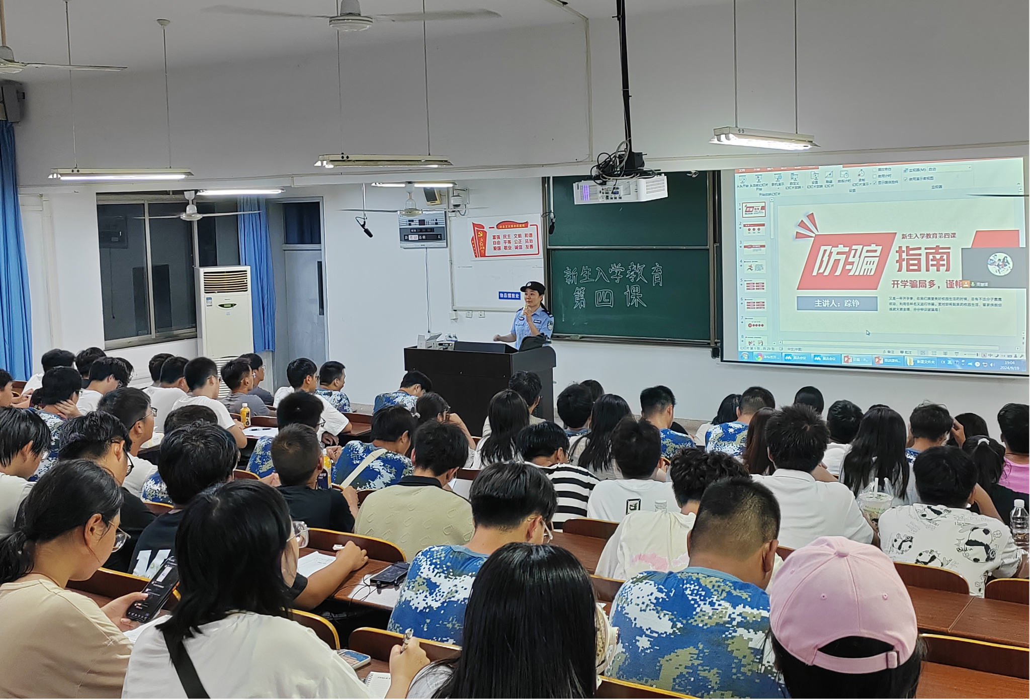 9月19日晚,踪铮警官在逸夫楼阶梯教室为2024级新生开展专题培训。踪警官以案释法、以法论事。她通过典型案例重点介绍了“购物类诈骗”“贷款诈骗”“杀猪盘”等新型诈骗方式,提醒大家时刻绷紧安全防范这根弦,保护好自己的钱袋子,筑牢反诈“安全墙”。
