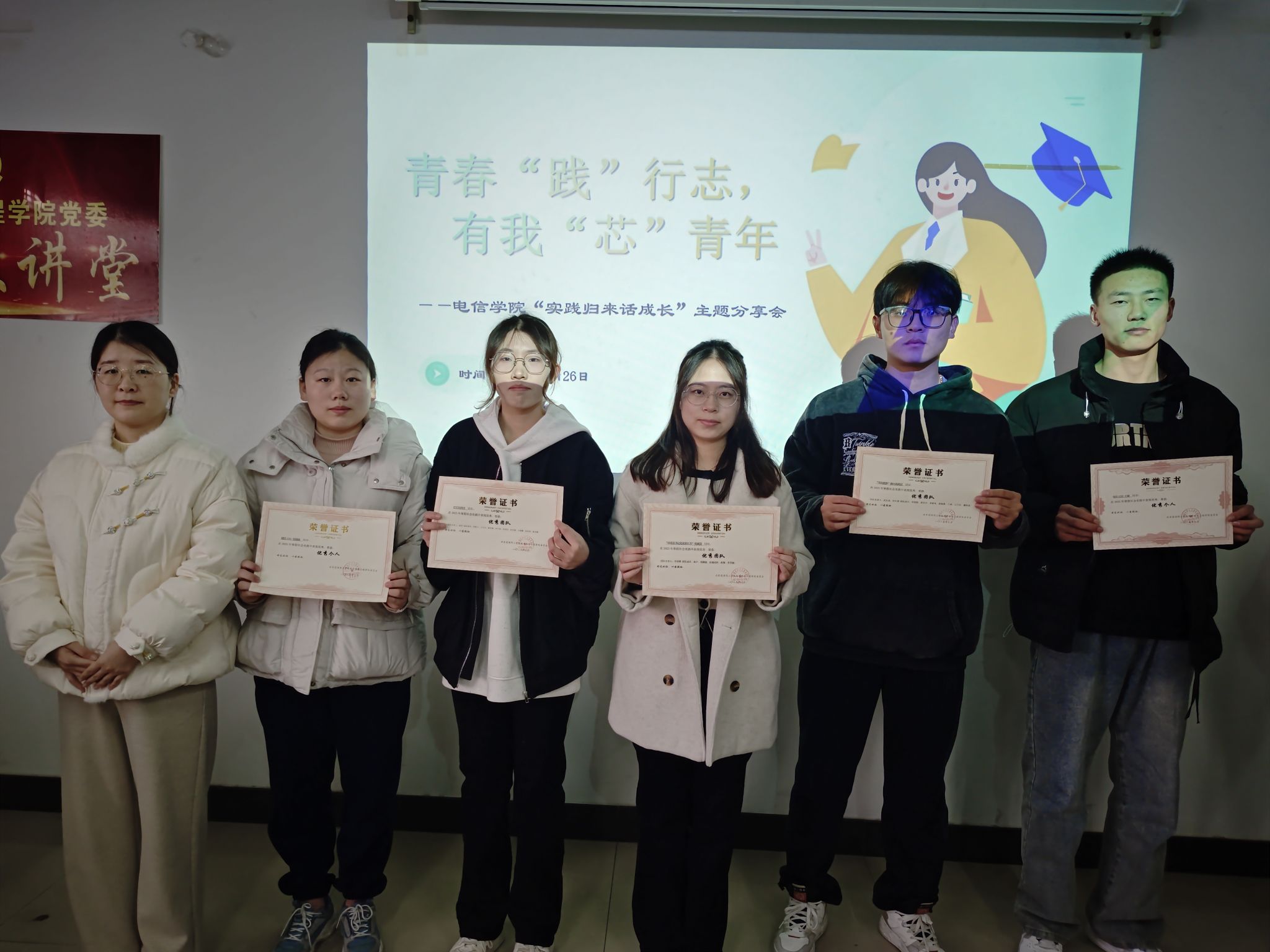 分享会上,韩莹对在寒假社会实践中表现突出的优秀团队和优秀个人进行了表彰,分别是“资助圆梦”微光实践团、红芯实践团以及“沿着总书记足迹看江苏”实践团和人工智能1241班的阚欣雨同学、通信1241班的张婧涵同学、电信1232班的王斌同学,并为他们颁发了荣誉证书。受到表彰的团队和个人依次分享了他们的实践经历和感悟,为后续实践团队提供了宝贵的实用范例,现场反响热烈,掌声连连。