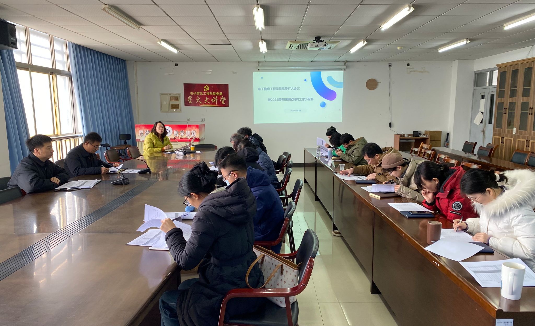 2025年3月3日,公司党委召开扩大会议,围绕 2025 届考研复试调剂工作展开深入研讨。公司党委书记韩飞、副经理(主持)季仁东、党委副书记王海云,公司各系主任、毕业班班主任和全体辅导员共同参会,会议由党委书记韩飞主持。
