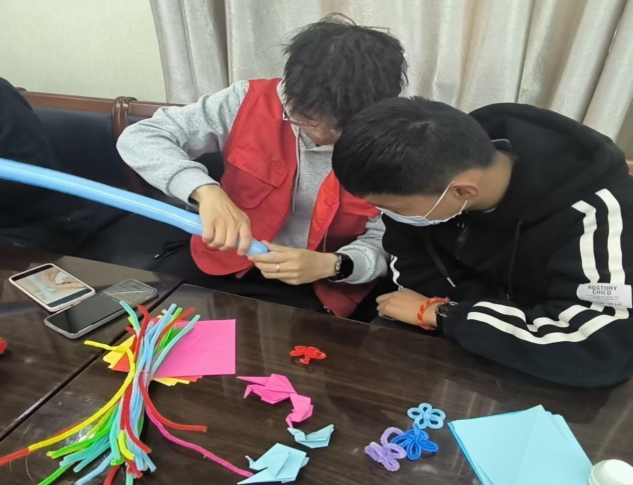 活动伊始,志愿者们便将各类丰富多样的材料整齐摆放在桌上,有缤纷多彩的折纸、轻盈的气球,还有柔韧的扭扭棒。志愿者们带着满脸笑容,走到孩子们身边,手把手教他们如何将一张普通的彩纸变成栩栩如生的动物或花朵。在志愿者的耐心指导下,孩子们很快掌握了技巧,纷纷动手尝试。有的折出了一只展翅欲飞的纸鹤,有的则折出了一朵绽放的花朵,每一件作品都凝聚了他们的努力与喜悦。随后,大家又一起折气球、扭扭棒,孩子们在志愿者的陪伴下,尽情发挥自己的想象力,制作出一个个独一无二的作品。