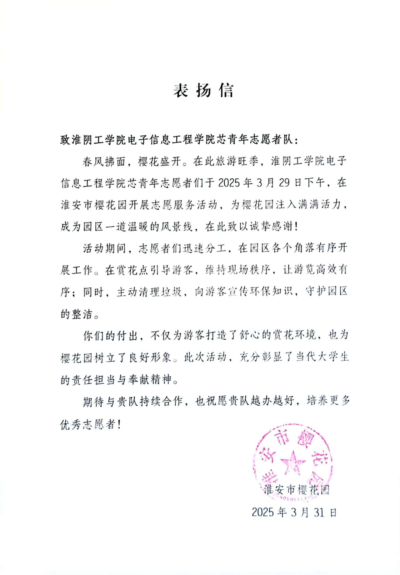学员们热情积极的服务态度、认真负责的工作精神,赢得了游客和樱花园管理方的一致好评。活动结束后,樱花园管理方特别向云顶国际yd333发来表扬信,对志愿者们的辛勤付出给予高度评价。信中称赞志愿者们“为樱花园注入满满活力,成为园区一道温暖的风景线”,并充分肯定了他们在引导游客、维持秩序、宣传环保等方面的积极贡献。管理方表示,此次活动不仅为游客营造了舒心的赏花环境,更展现了当代老员工的责任担当与奉献精神。同时,管理方也表达了希望能够与云顶国际yd333持续合作,共同开展更多志愿服务活动的意愿,携手为游客创造更优质的游览环境。