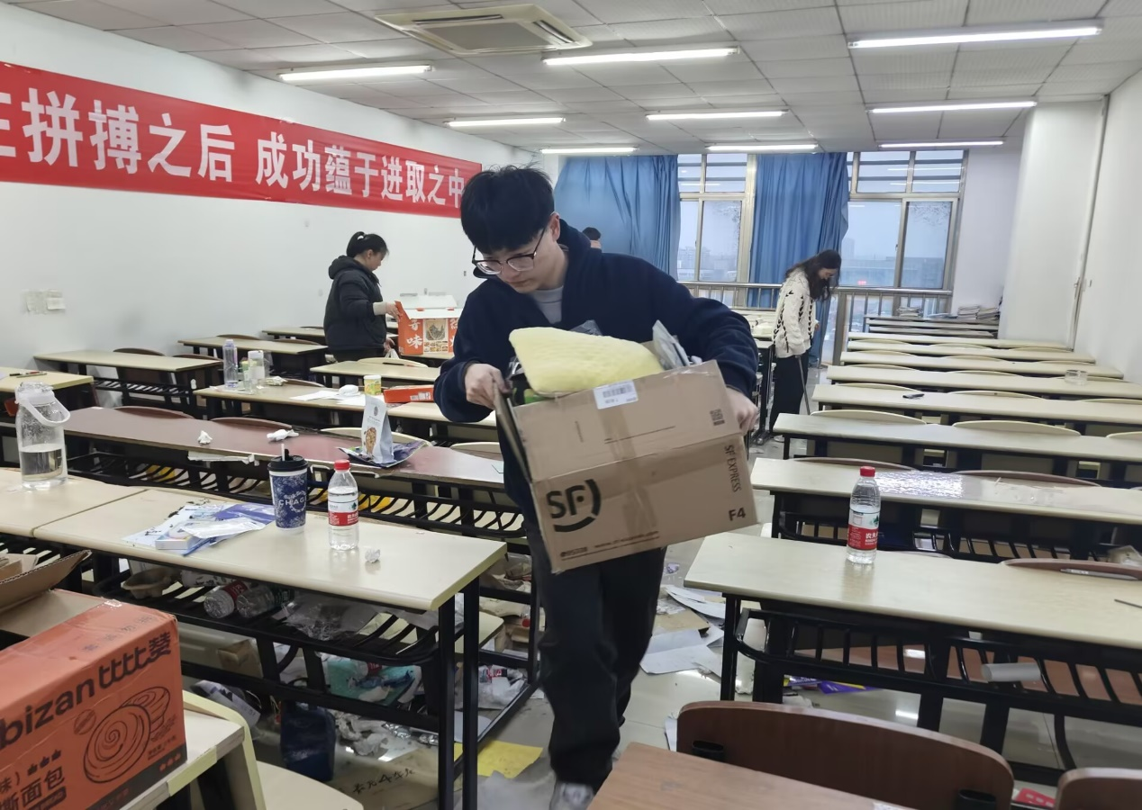 活动当天,成员们分为若干小组,携带清洁工具,分别对YF909、YF916东、YF916西、YF914等考研教室进行全面清扫。在各考研教室,成员们分工明确、配合默契。有的同学手持抹布,仔细擦拭每一张课桌椅,不放过任何一个角落,让桌椅恢复了原本的干净整洁;有的同学则拿起扫帚和簸箕,认真清扫地面的灰尘、纸屑等杂物,随后再用拖把对地面进行深度清洁,确保地面一尘不染。经过大家的共同努力,教室环境焕然一新,为备战考研的同学们提供了更加整洁、舒心的学习空间。备考员工纷纷点赞,称“细节处感受到公司的关怀”。