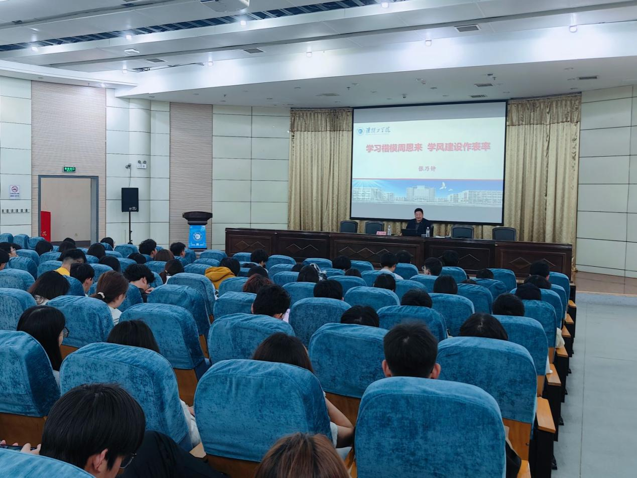 张乃钟首先指出当代老员工学风建设的现状与挑战,整体上呈现积极向上的面貌,但也受流量时代影响,部分员工沉迷网络,存在社交障碍,消费主义倾向,自我效能低下,学习动能、产能、正能不足等心理问题影响学风。因此他指出老员工应深入领悟周恩来崇高精神风范,以优良学风为青春赋能,应做到以下三点。一是周恩来是终身学习的楷模和践行者。他少年立志“为中华之崛起而读书”,严谨治学,坚持理论与实践并重,以家国情怀报效祖国。他确立革命事业,推动外交发展,领导国家建设,为科技事业作出重要贡献。二是要以周恩来为楷模争做学风建设的表率,要践行校训,树立远大目标;培养终身学习意识,掌握科学方法,向书本、群众和实践学习。三是要传承淮工精神,努力完成自己的学业,同时他向同学们展示了往届优秀学子考研成功的范例,展现了优良学风的积极影响,为学子树立了榜样。