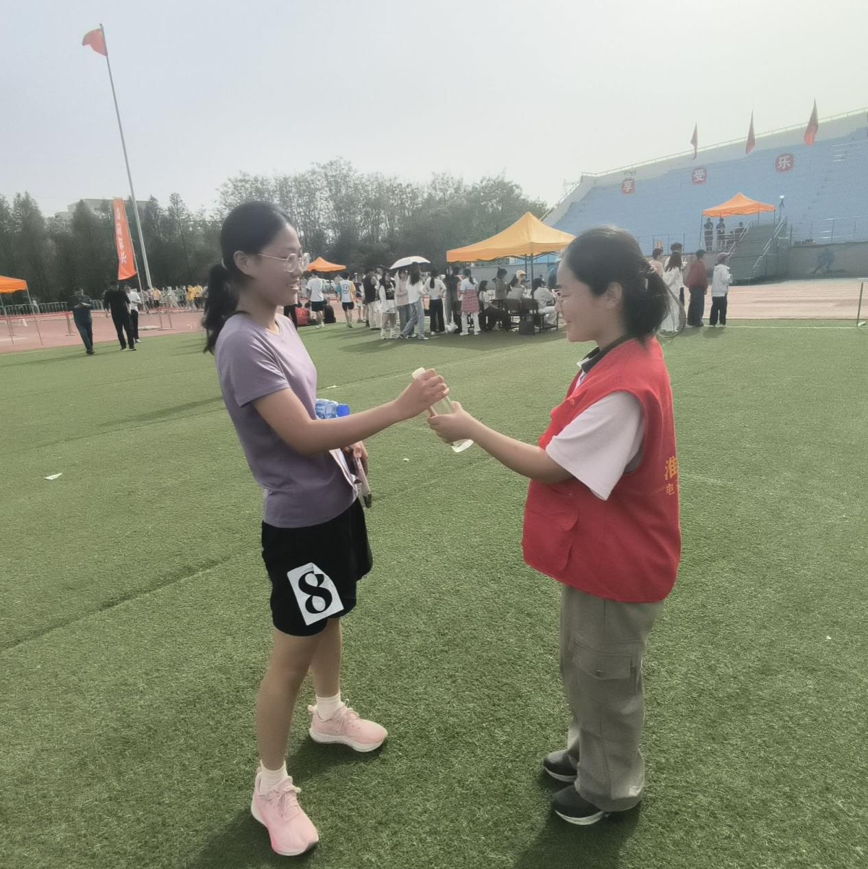 比赛过程中,志愿者们时刻关注着运动员的状态。当运动员在赛场上奋力奔跑、跳跃时,他们在场边呐喊助威,用热烈的掌声和欢呼声为运动员们注入强大的动力。一旦运动员完成比赛,志愿者们会第一时间迎上去,递上早已准备好的水和补给品,帮助运动员补充能量、缓解疲劳。同时,他们还会细心地为运动员保管好衣物、背包等物品,让运动员们能够毫无后顾之忧地投入到比赛中。