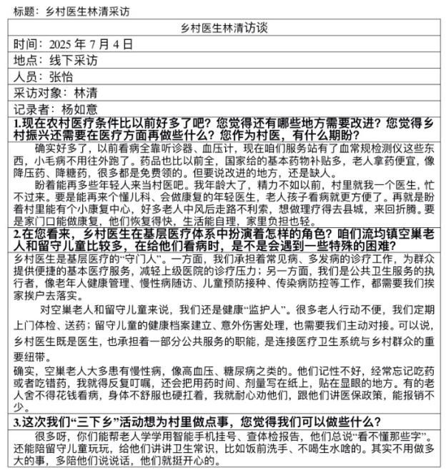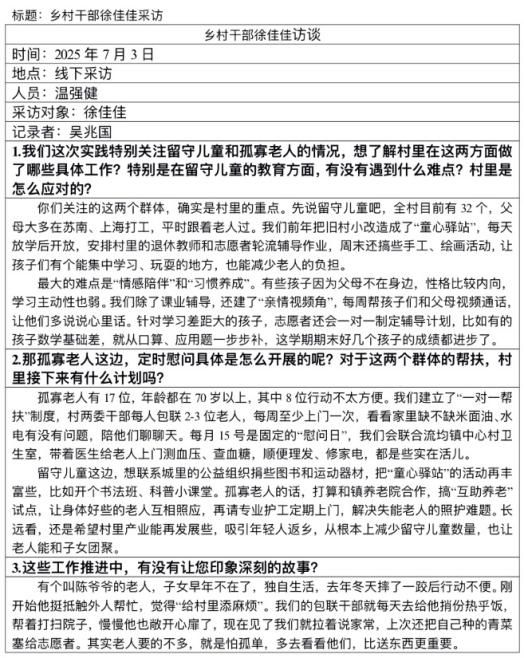 7月3日至4日,实践队成员张怡、杨如意和温强健、吴兆国分别对乡村医生林清和乡村干部徐佳佳进行了访谈,了解了基层工作面临的挑战与需求。林清医生坦言,虽有血常规检测仪等设备改善诊疗条件,但全村仅她一名医生,急需懂儿科、康复的年轻人加入,更盼村里能建康复中心,解决老人理疗难问题。徐佳佳则介绍,村里32名留守儿童多由老人照料,“童心驿站”虽能辅导作业,却难补情感陪伴缺口;17位孤寡老人中8位行动不便,“一对一帮扶”虽能解燃眉之急,仍需长效机制支撑。