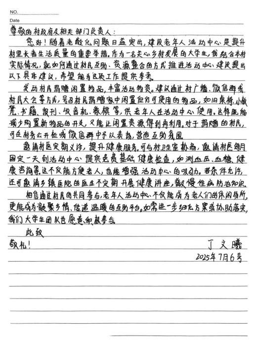 在深入了解流均镇中心村的实际情况后,“芯”联中心实践队针对老年人服务中心和留守儿童阅读室提出了建设性意见。队员们发现,老年人服务中心在设施配备和活动组织方面还有提升空间,建议增加更多适合老年人的健身器材和文化活动,丰富他们的日常生活。对于留守儿童阅读室,队员们建议扩充图书种类,增加儿童科普书籍和经典文学作品,同时定期组织阅读分享活动,培养孩子们的阅读兴趣和习惯。这些建议得到了村民干部的高度认可,也为当地的社会服务设施建设提供了新的思路和方向。