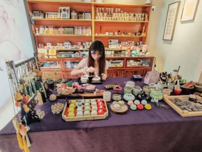 带着这份思考,团队于 7 月 3 日走进文庙街区,向非遗制香技艺传承人学习古法制香。在传承人指导下,大家亲手制作了三款实用香包:针对鼻炎的香包以辛夷、苍耳子为核心,辛夷通鼻窍、散风寒,苍耳子缓解鼻塞流涕;提神醒脑香包融入薄荷与陈皮,薄荷清凉开窍,陈皮理气醒神,二者搭配香气清冽;驱蚊香包选用艾草与丁香,艾草含天然驱蚊成分,丁香浓郁香气可有效驱蚊虫。在揉捻、配伍、装袋的过程中,成员们不仅掌握了基础香料的配比逻辑,更深刻体会到“君臣佐使”的中药配伍智慧。如同调香一般,每种材料都有其独特价值,唯有相互配合,才能发挥出最佳功效。这恰恰是传统制香技艺中“和而不同”的文化内核所在。
