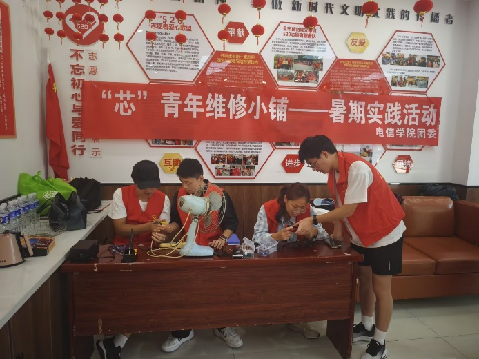 当天下午,团队负责人温强健带领成员邰乾晟、宋子硕、张翔、阚欣雨投入紧张的检修服务。活动现场气氛热烈,老人们纷纷送来故障的电风扇、热水壶、烫发器、电热毯等电器。成员们逐一进行拆解检查,因现场部分元器件不足,最终仅成功修复一个热水壶。当指示灯亮起的瞬间,成员们内心的喜悦与成就感油然而生。这不仅是对大一学年书本知识的学以致用,更是“维修传情”服务理念的真切体现,让芯青年在动手实践中深化了对专业知识的理解。