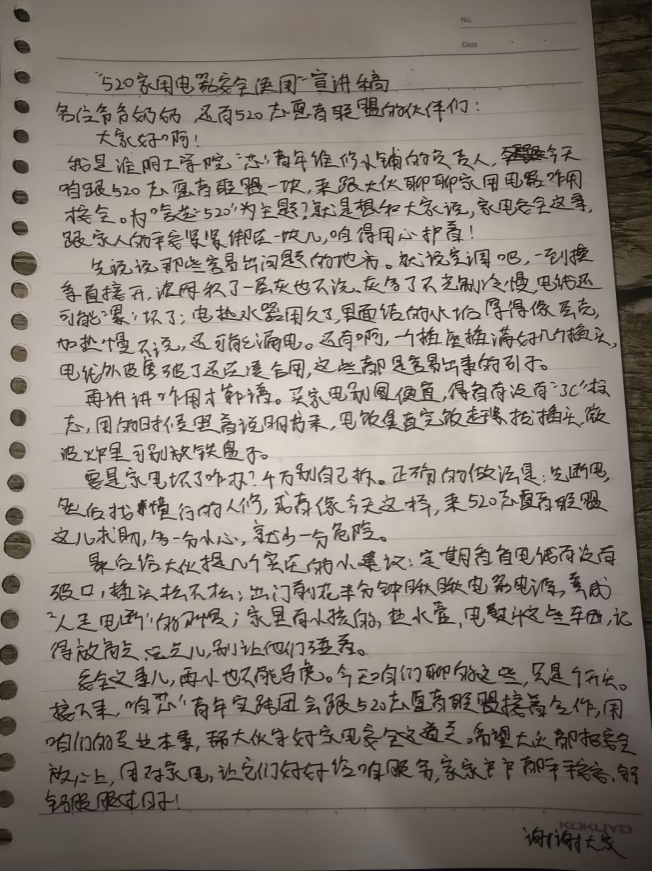 维修服务结束后,团队随即开展了“520家用电器安全使用”主题宣讲。针对前期调研发现的老年人用电常见隐患,成员们运用通俗语言与鲜活案例,详细讲解了家电安全规范、日常维护技巧及故障应急处理方法。现场听众专注聆听,纷纷表示收获颇丰。此次宣讲有效提升了老年群体的安全用电意识和自我保护能力,为他们的居家生活筑牢了安全屏障。