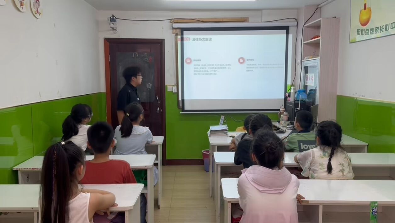 针对留守儿童法律意识薄弱、易受侵害的问题,专项活动特别开设 “法治伴成长” 主题课堂。在江苏省淮安市金湖县,沈楷淳开展的 “未成年人保护法” 专题课程直击儿童成长中的法律痛点,通过细致解读法律条文,让未成年人能知法、守法、用法;在江苏省淮安市涟水县的课堂上,王越带领孩子们通过情景模拟 “陌生人搭讪怎么办”、角色扮演 “派出所调解纠纷” 等互动形式,让孩子们在亲身体验中学会识别风险、掌握依法维权的方法,为孩子们的健康成长撑起法治 “保护伞”。