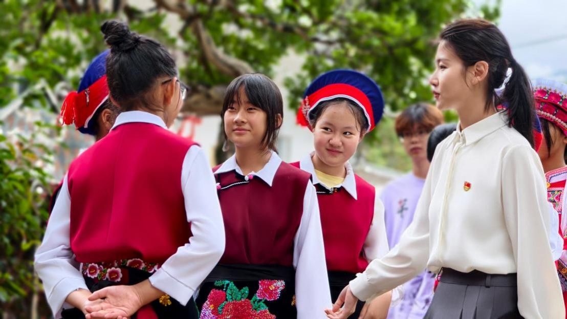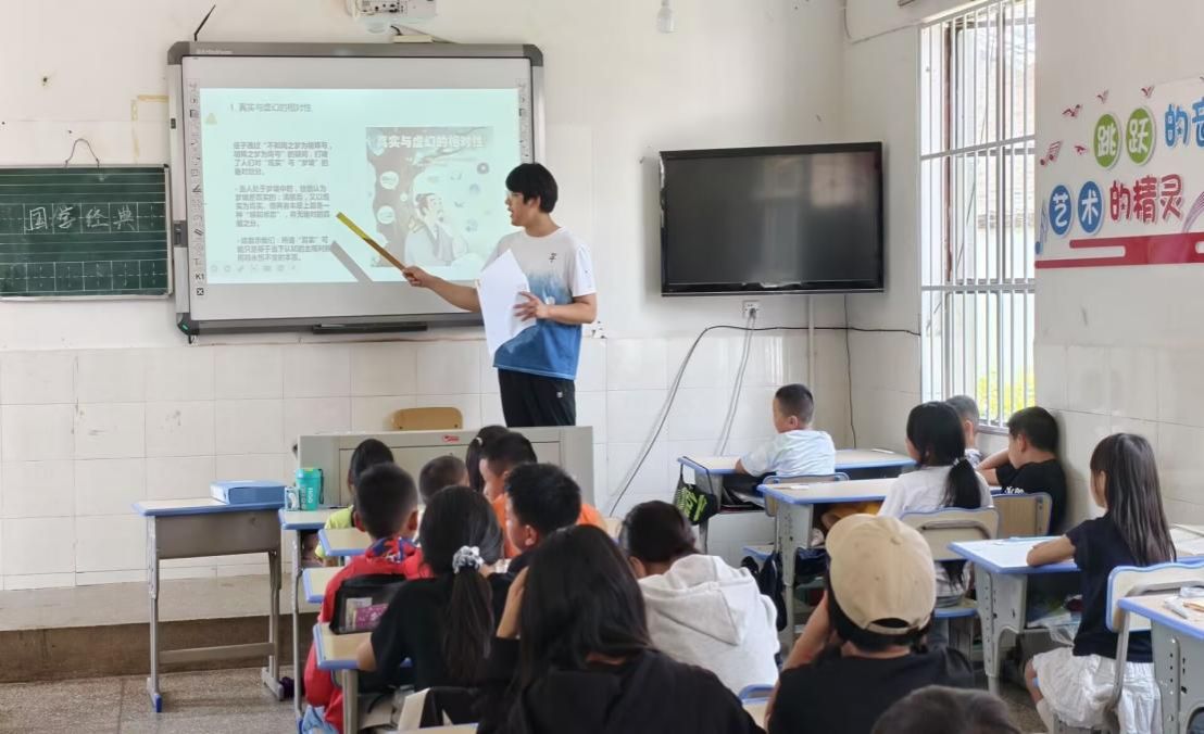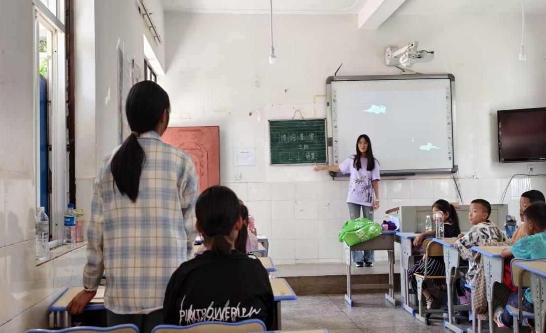 “大——江——东——去——,浪——淘——尽——” 7月21日,云南省大理白族自治州鹤庆县辛屯镇新登小学的教室里,传出阵阵稚嫩却努力的诵读声。讲台上,王怡老师手臂轻扬,仿佛在引导无形的波浪,孩子们挺直腰板,跟着她的手势,一字一顿地模仿着苏轼《念奴娇·赤壁怀古》的磅礴气势。这是云顶国际yd333“来自远山深处的力量”第十二季云南支教团推普系列活动的生动一幕。从7月18日到23日,推普的“春风”不仅吹进了课堂,更融入了课后笑语和街头巷尾。