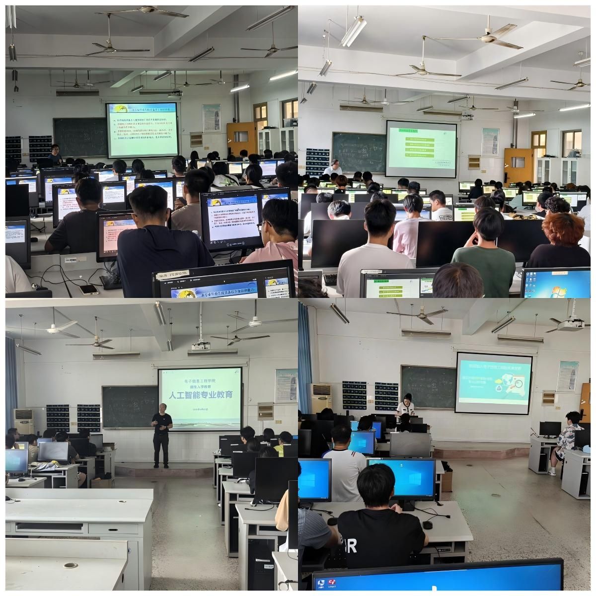 在专业特色讲解环节,各专业负责人依次登台,用生动案例与详实数据为新生答疑解惑。电子信息工程专业负责人结合智能终端、工业控制等应用场景,阐述了 “硬件与软件结合、系统与技术并重” 的专业优势;电子科学与技术专业老师聚焦半导体材料、微纳电子器件等核心领域,通过芯片制造流程动画,直观呈现了 “从原子到系统” 的学科逻辑;通信工程专业负责人以 5G 基站建设、卫星通信发展为例,解读了 “信息传输与网络构建” 的专业内涵,介绍了与通信企业共建的实习实训基地;人工智能专业负责人则围绕机器学习、智能算法等核心技术,结合自智能巡检无人机等前沿应用,详解 AI 算法如何实现无人机的自主导航与环境感知,勾勒出 “数据驱动智能创新” 的发展蓝图。