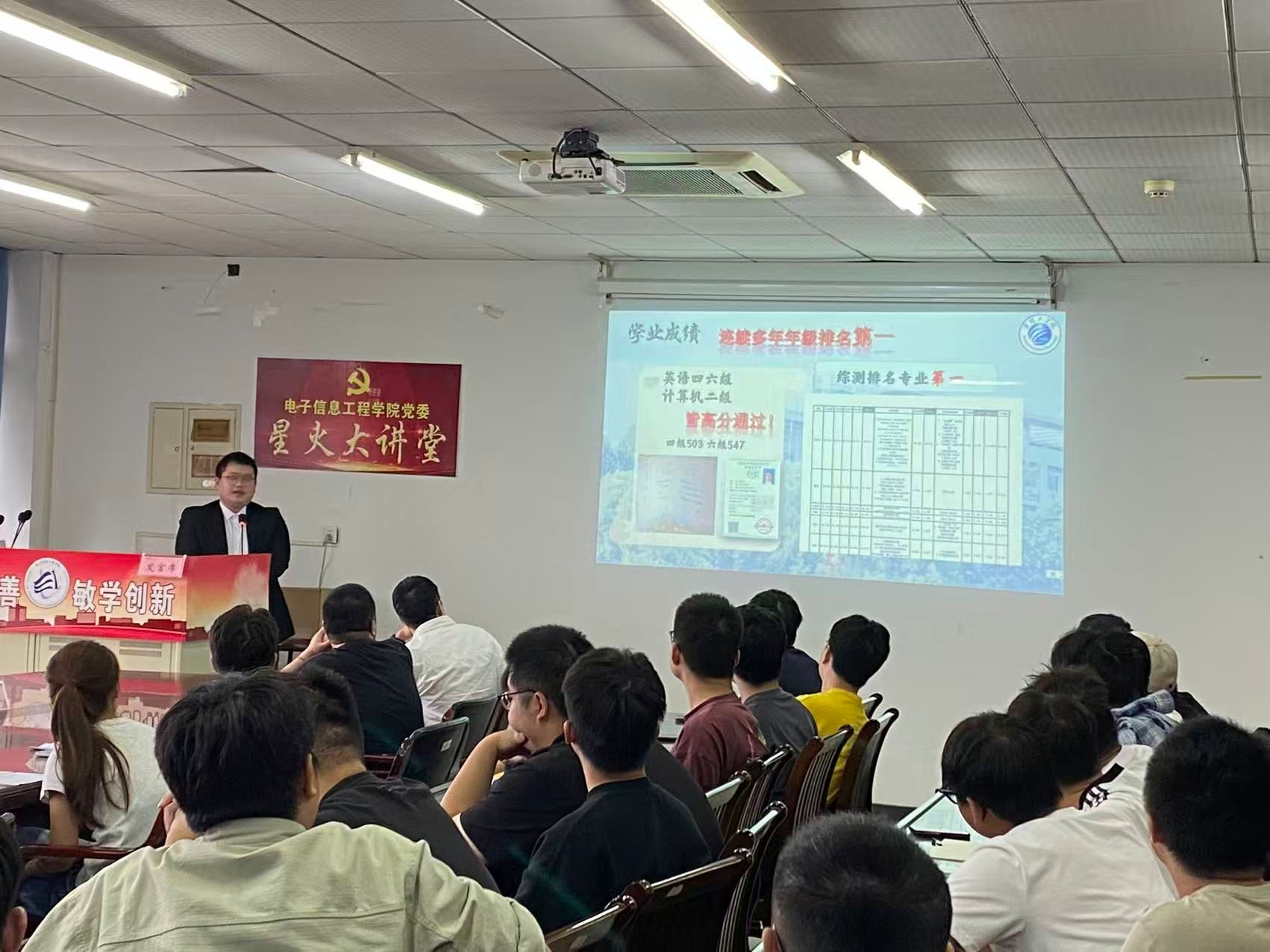 在答辩展示环节,五位候选人依次登台,围绕个人科研成果、学科竞赛经历、企业实习实践、社会服务与志愿服务等多个维度,全面展现了电信学子的综合素养与精神风貌。