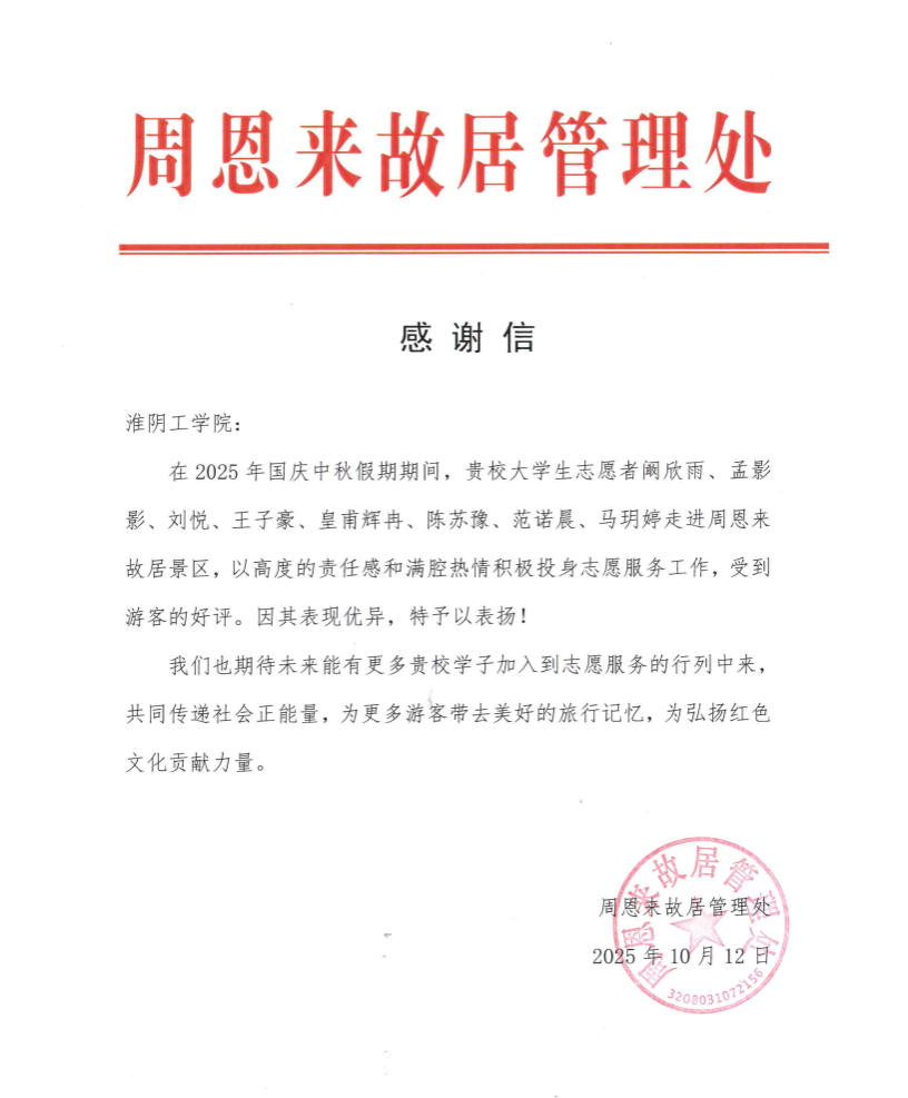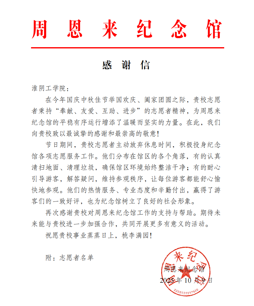成员们热情周到的服务态度与认真负责的工作精神,赢得了游客与工作人员的一致好评。活动结束后,周恩来纪念馆和周恩来同志故居特别向公司发来感谢信,对志愿者们的辛勤付出表示高度赞赏,并充分肯定了他们在引导参观、维护秩序等方面所做出的积极贡献。此次活动不仅提升了游客的参观体验,更生动展现了云顶国际yd333青年老员工的责任担当与奉献精神。